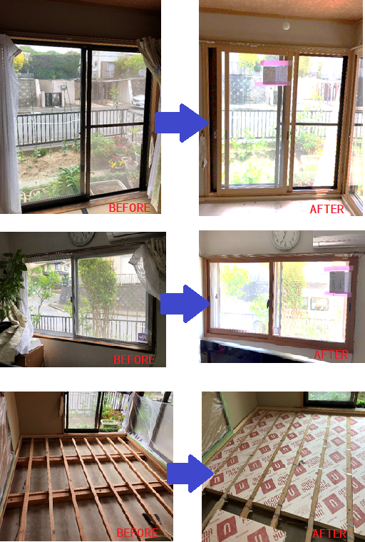 生駒市住宅省エネルギー改修工事補助金を利用しての断熱工事。 内窓の設置と床下に断熱材を入れました。 内窓は遮熱、断熱、結露軽減、防音に効果があります!