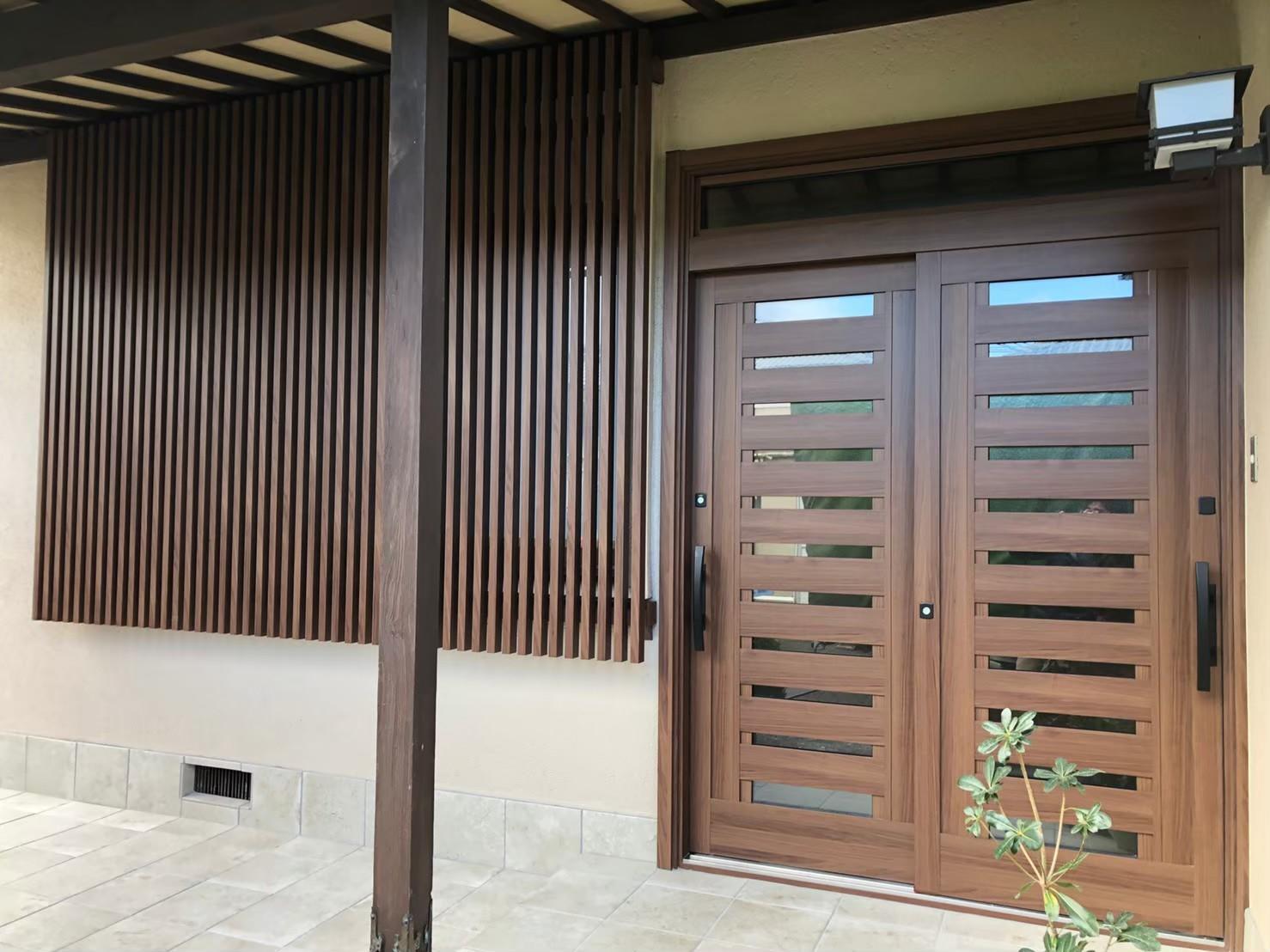 玄関はリクシル・リシェント、 縦格子はリクシル・コートライト、 フロアタイルは、リクシル・ベスパ