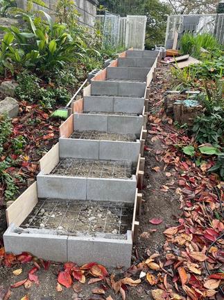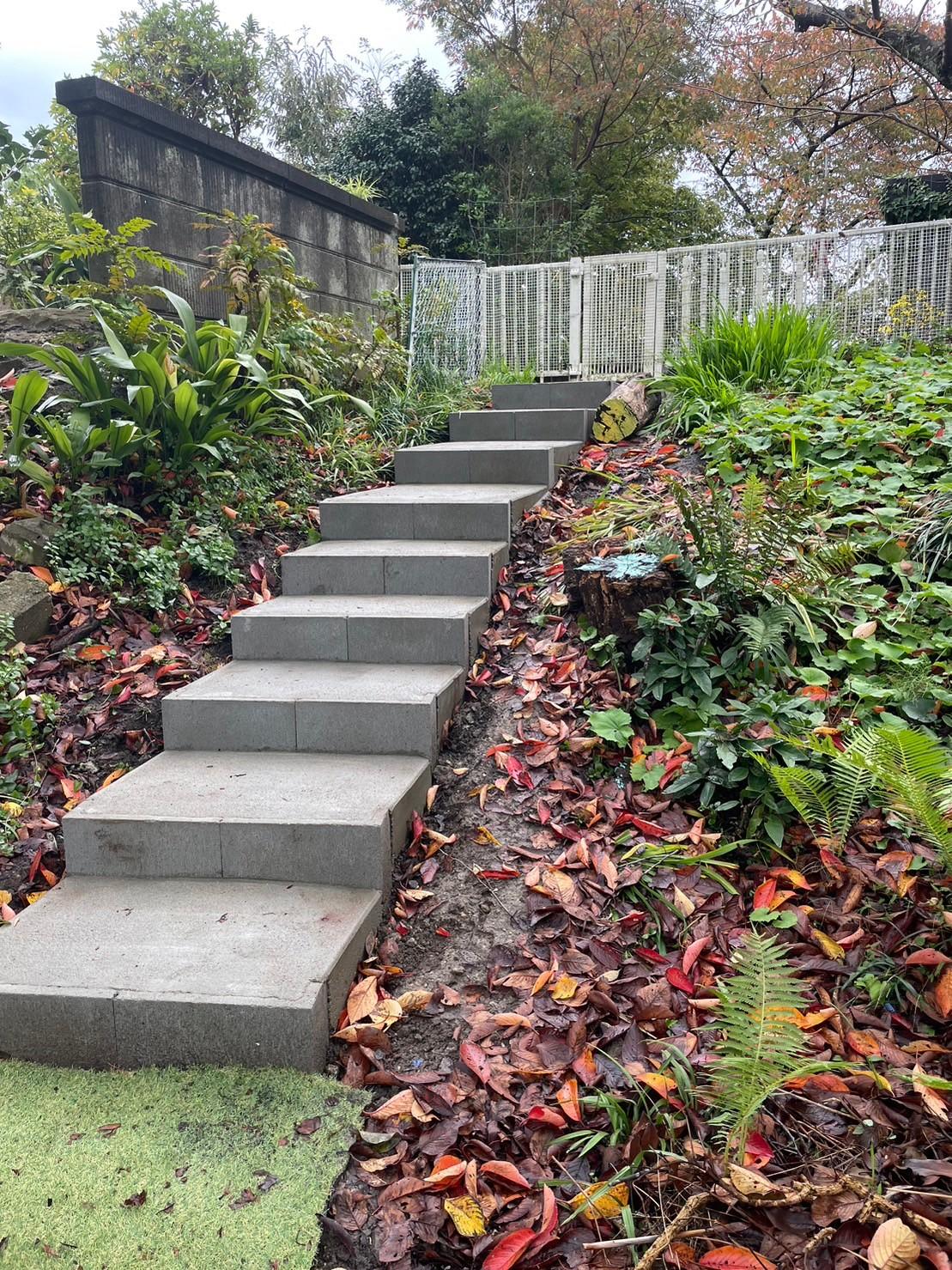 外構階段工事 ①ご主人がかなり前にDIYで作った階段が朽ちてきており、行き来しにくいとの事でした。 ②今の階段を解体して、新しいものを作ります。 ③鉄筋を組んだ上にコンクリートで固めます。 ④とても頑丈で、行き来しやすい階段が出来上がりました。