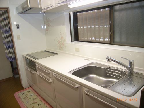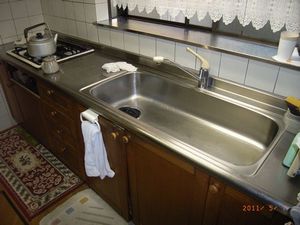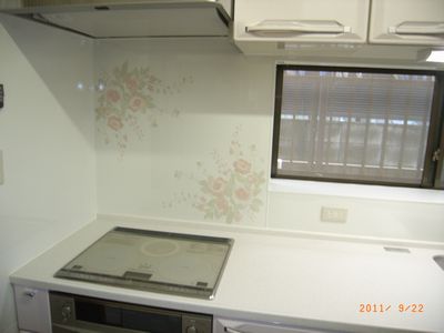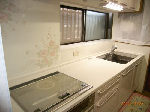 キッチンが暗いので明るくしたいとお施主様のご希望でキッチン、パネル、壁紙を明るくやさしい色合いにしました。