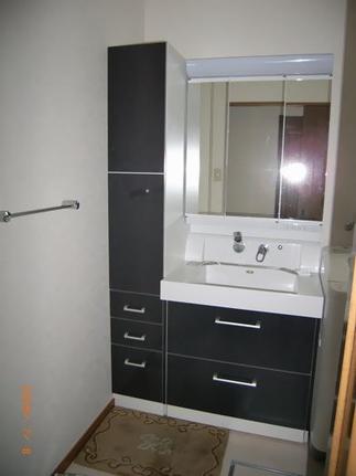 間口30センチの収納キャビネットと間口75センチの洗髪洗面化粧台を配置しています。