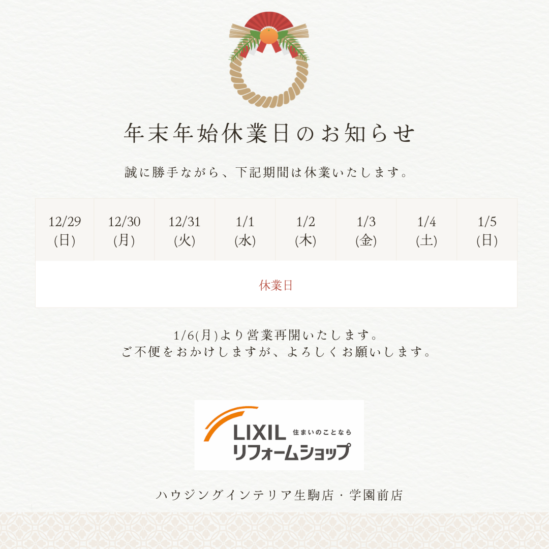 誠に勝手ながら、12月29日(日)から1月5日(日)までの期間、当社は年末年始休業日とさせていただきます。