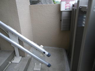 介護保険を利用されて、屋外リフトの取り付けをさせていただきました。 全面道路と家屋との高低差があり、介護を必要とするご家族の為、勝手口から直接家に上がれる ようにリフトを取り付けました。 雨の日も濡れないようテラス屋根も連続して設置しました。 ご本人のご利用の他、重い荷物の運搬にも使っていただいています。 「このリフトのお陰で、外出が億劫にならなくなりました。」と喜んでいただいております。