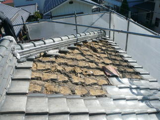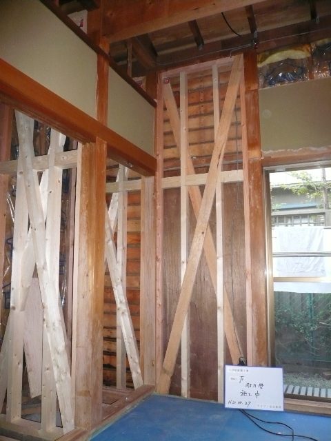役所の検査のもと耐震検査の結果をふまえ、補強計画をたて施工しました。今回は壁補強と屋根の軽量化を施しています。