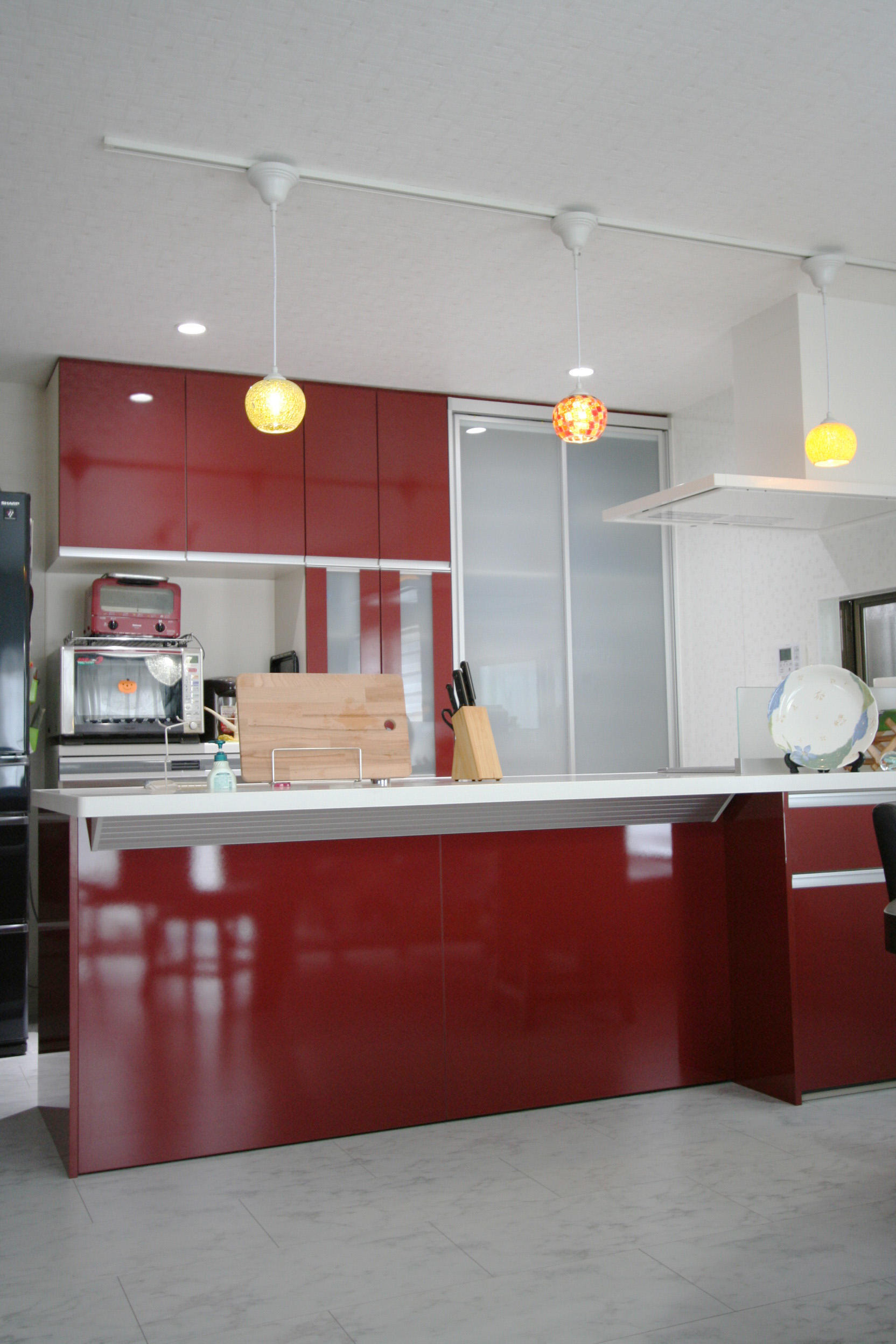 真っ白の壁紙に、大理石調のフロア。ディープレッドのキッチンを引き立ててくれます。