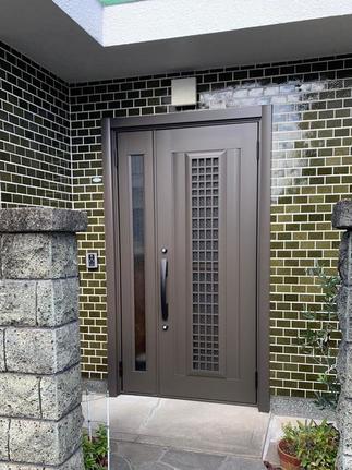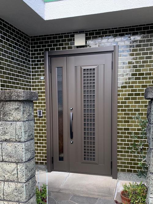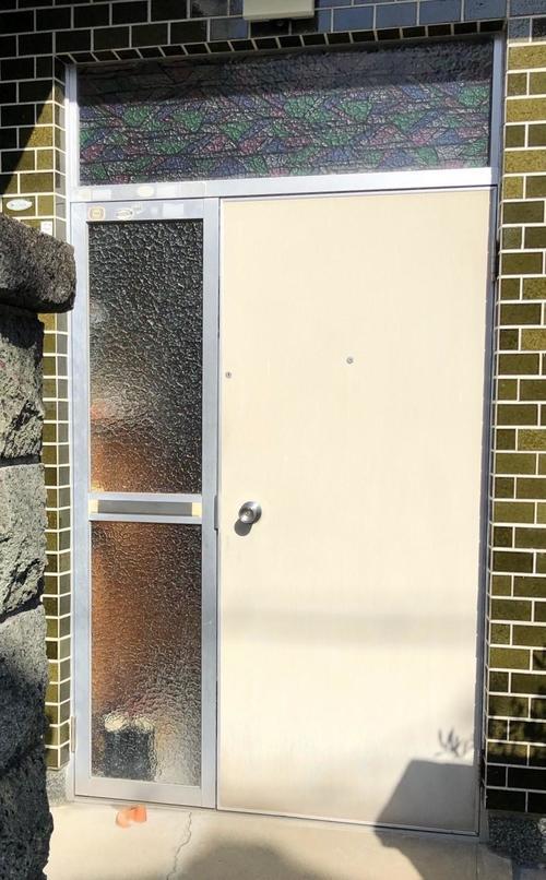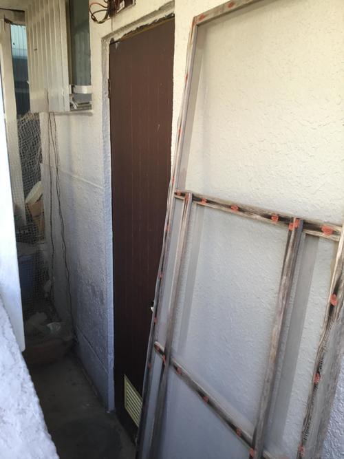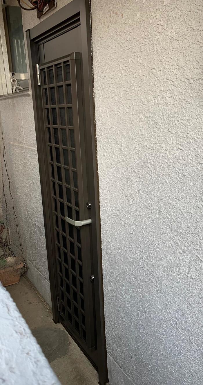 築40年お住まいのI様邸の勝手口と玄関を1度にリフォームさせていただきました。まずは木製の勝手口をから。老築化で木がめくれたり湿気でカビが生えたりと悩んでいたところ、自社のチラシを長く保管してくださりご相談をお受けいたしました。ありがとうございます(*^^*)湿気が多い勝手口には、鍵を掛けたまま格子のついた窓を開けておけるため防犯上も安心できて風も取り入れることができるリシェント(アルミSG仕様B型ランマ無し)をご提案させていただきました。