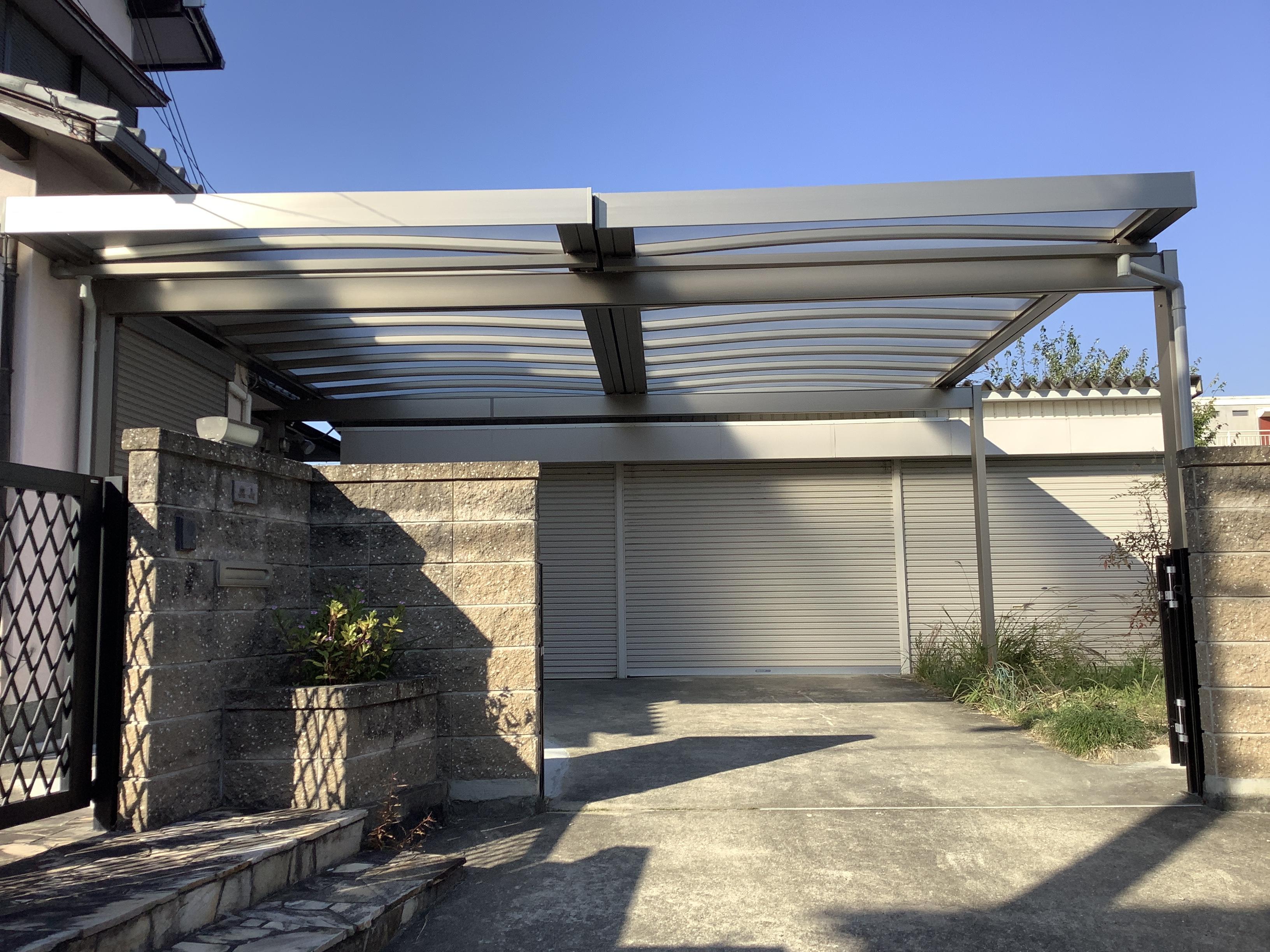 三協アルミ U.スタイルアゼストにしました。強度的にしっかりしていて台風が来ても安心。奥様も車に乗るので濡れないように2台分のカーポートをご提案させていただきました。