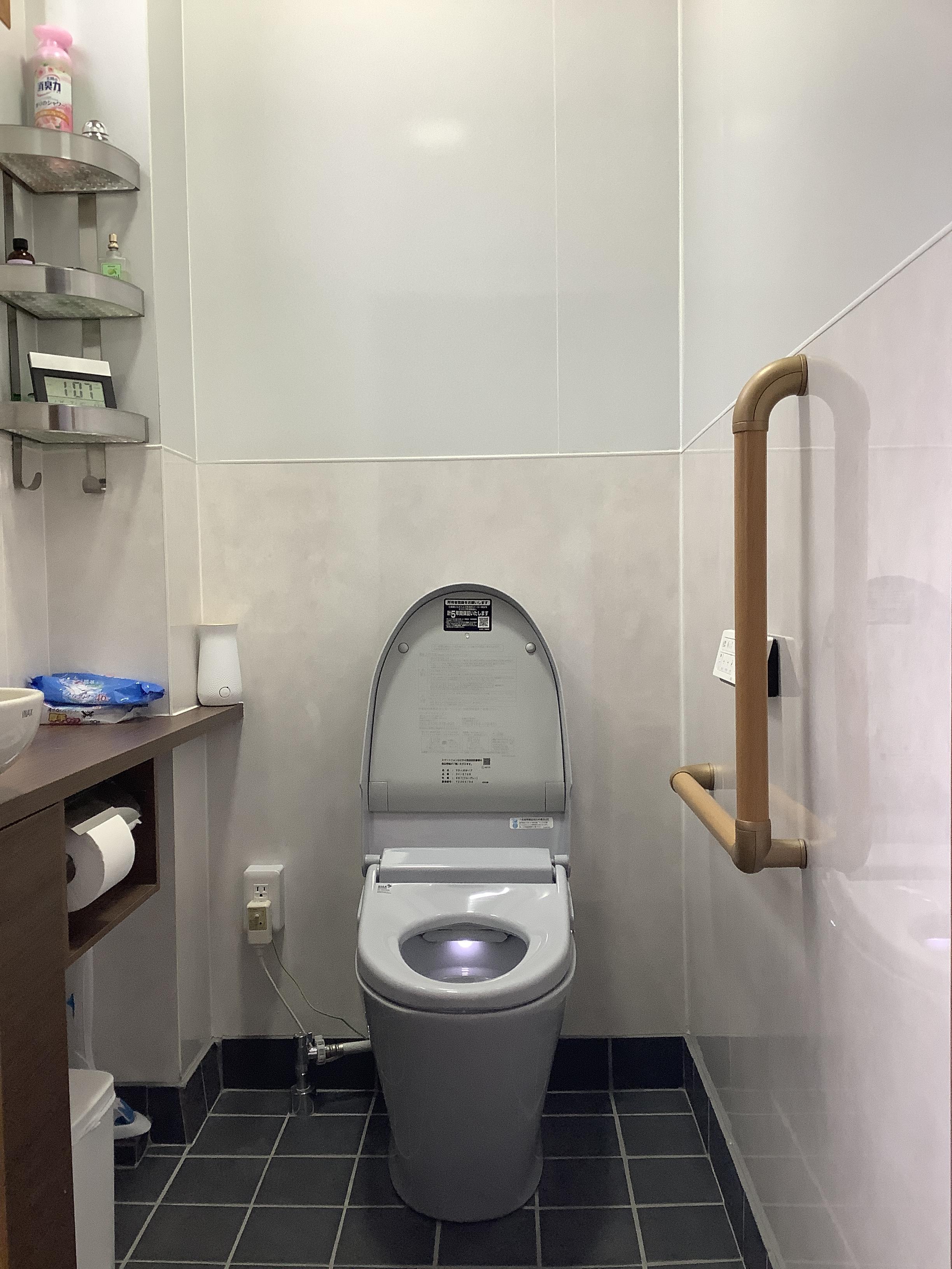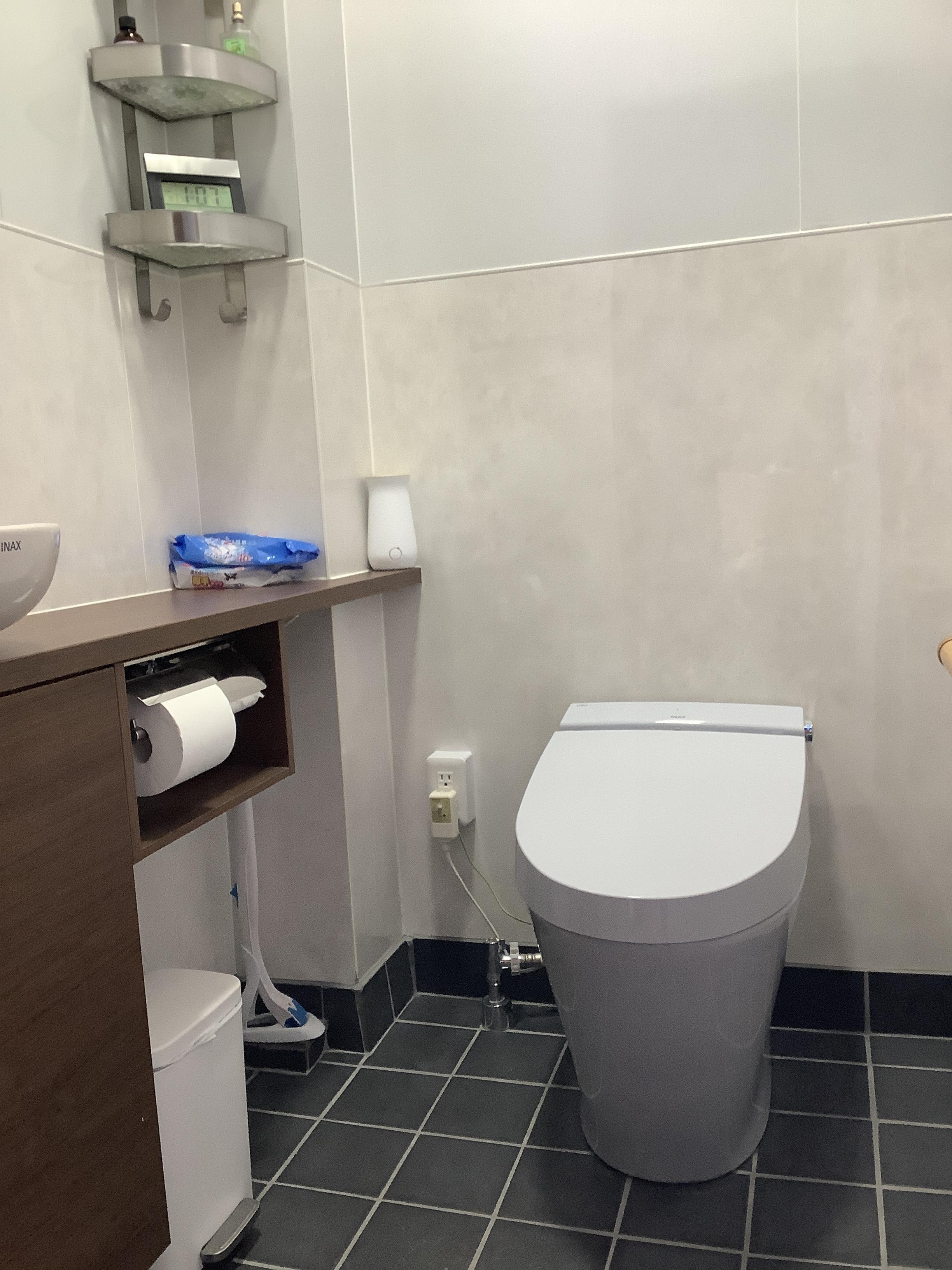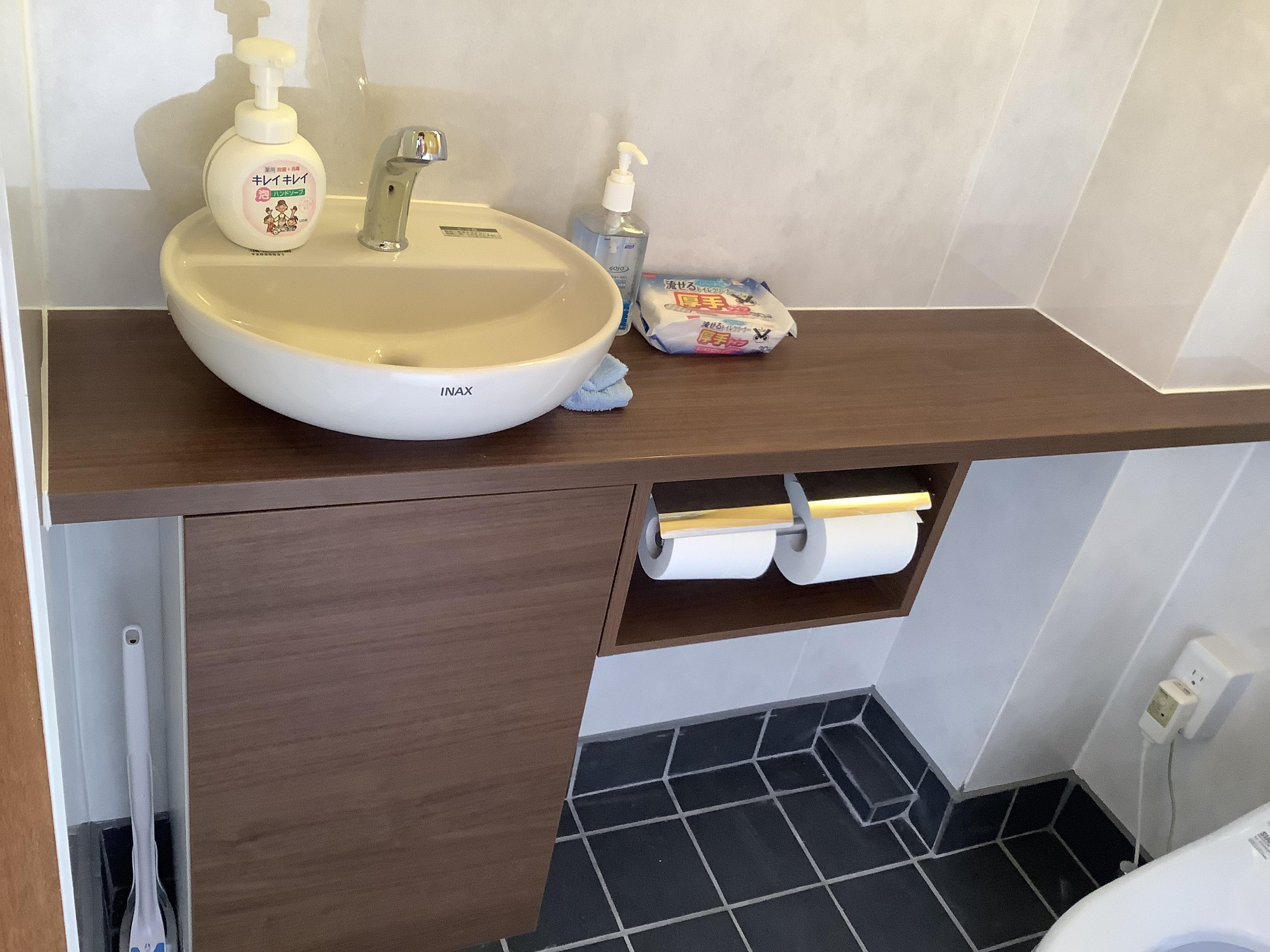 年配のお客様が増え段差をなくすことで楽になるようにしました。 オーナー様が毎日トイレ掃除をすると聞き、掃除が楽にできるように壁はパネルにしました。 キャビネットはサイドの広いスペースを活用し収納ができるLIXILキャパシアをご提案しました。 床をシックなダークグレーにし便器をブルーグレーにすることで空間にメリハリをつけました。