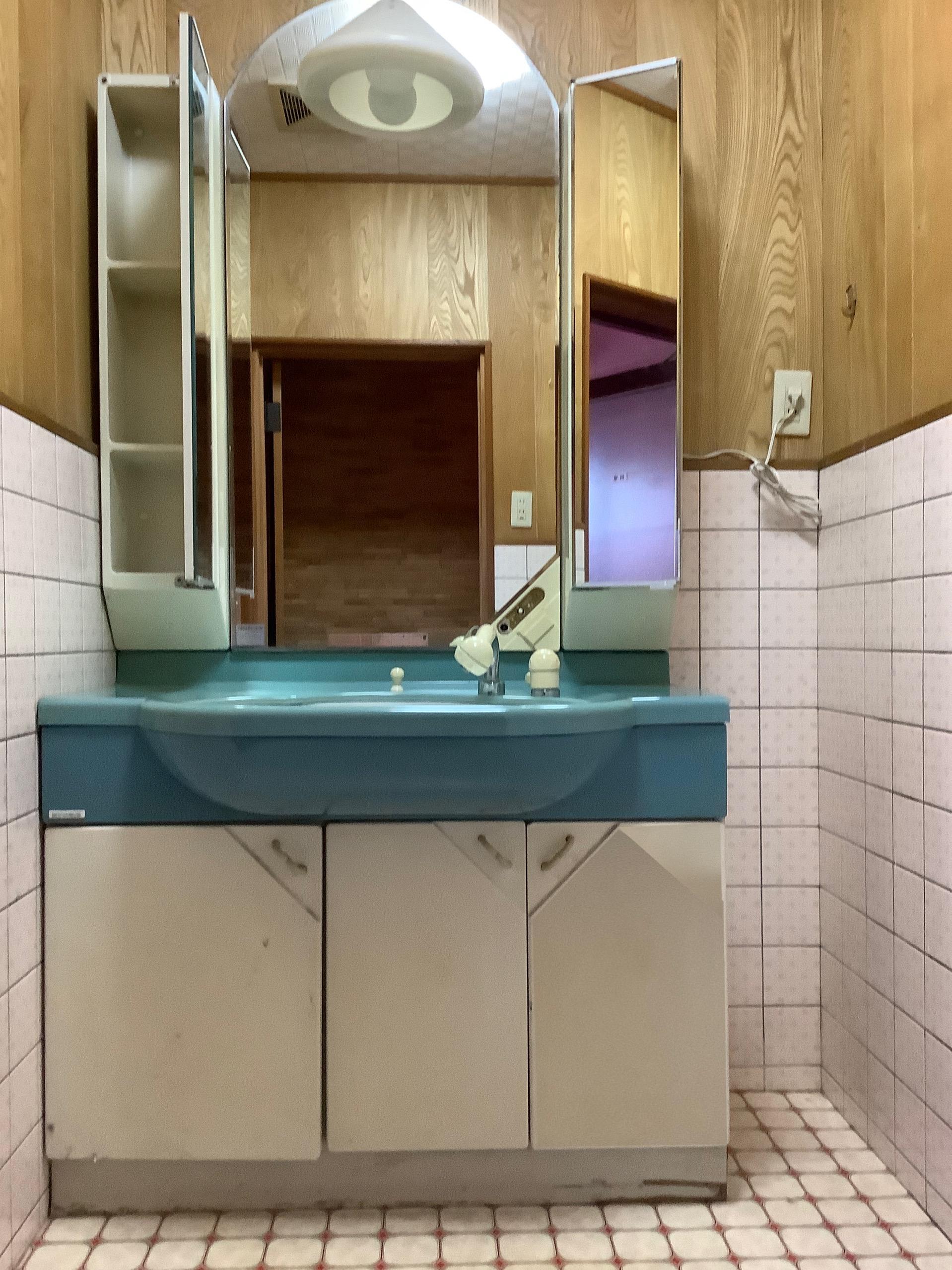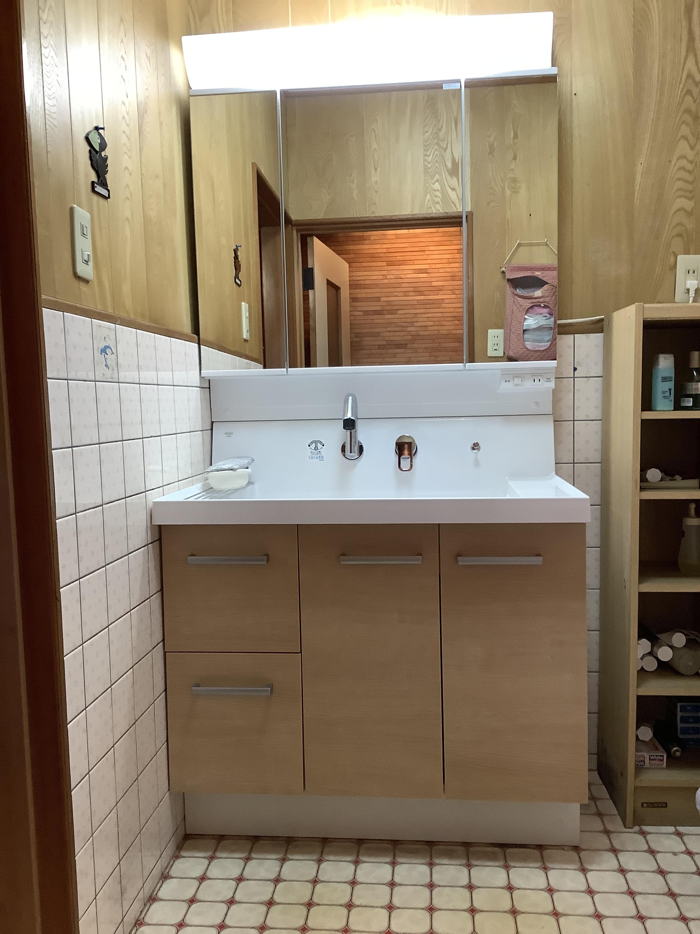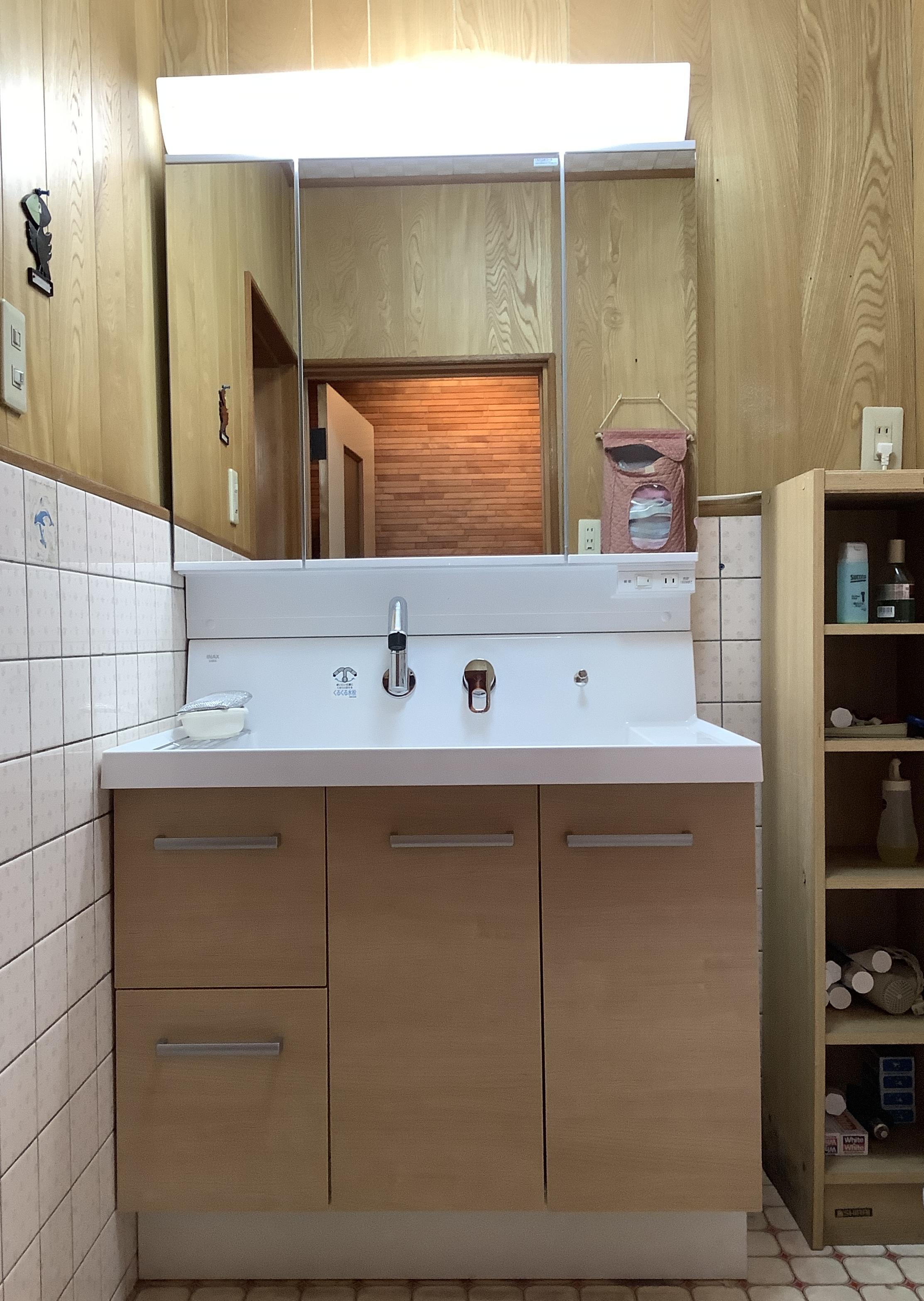 築35年戸建てお住まいのT様邸の洗面化粧台の交換です。水漏れが発生していましたが修理対象不可のためリフォームすることとなりました。洗面所の腰壁上の木目に合わせ木目調の洗面台ピアラを選択しました。ナチュラルな木目で統一されあたたかみのある空間となりました。間口が1m→90㎝にし、ワンサイズ小さくすることで棚を置き収納するスペースを確保しました。