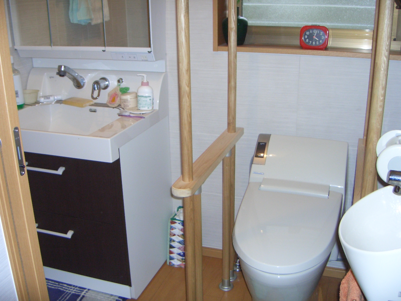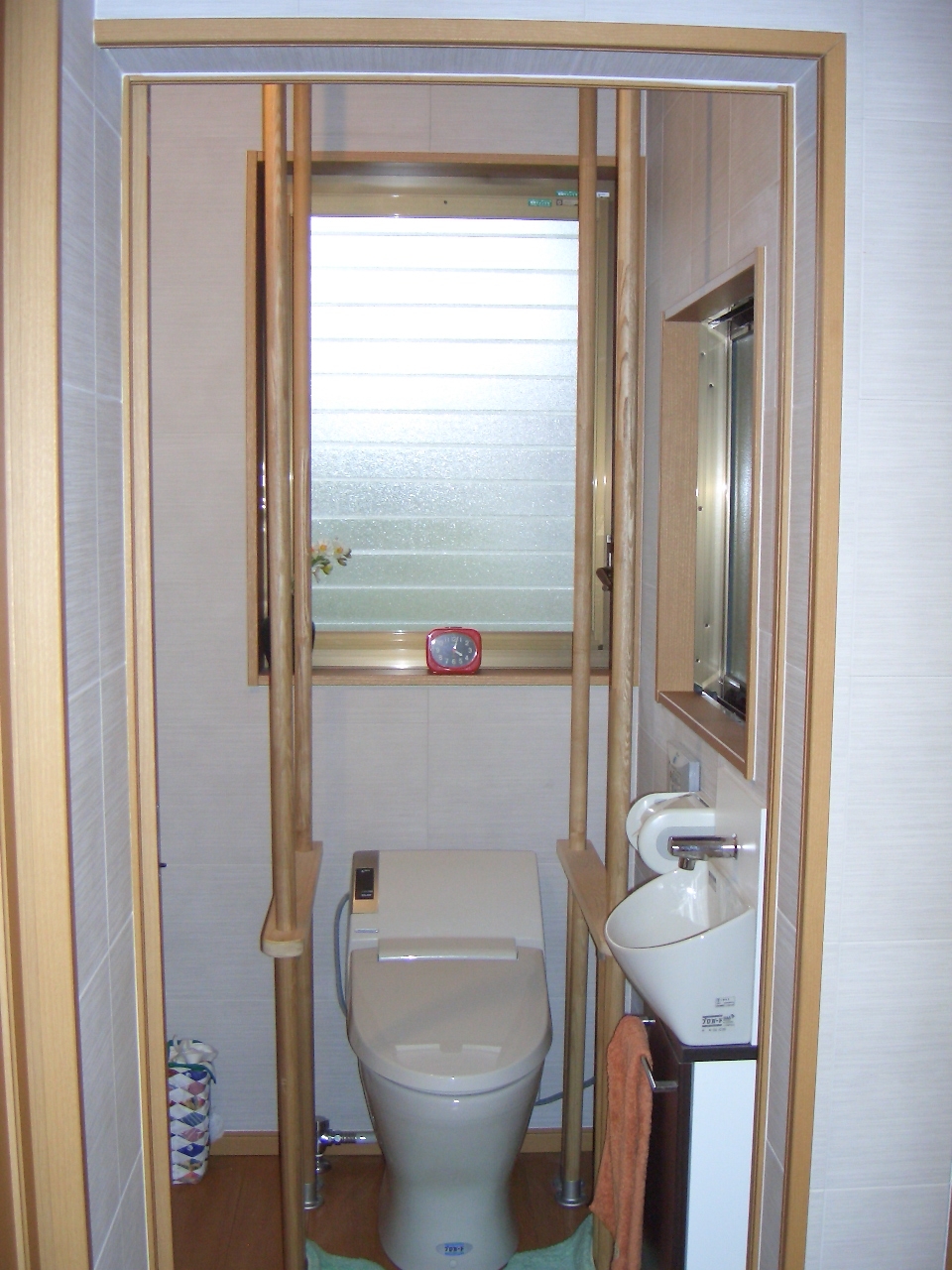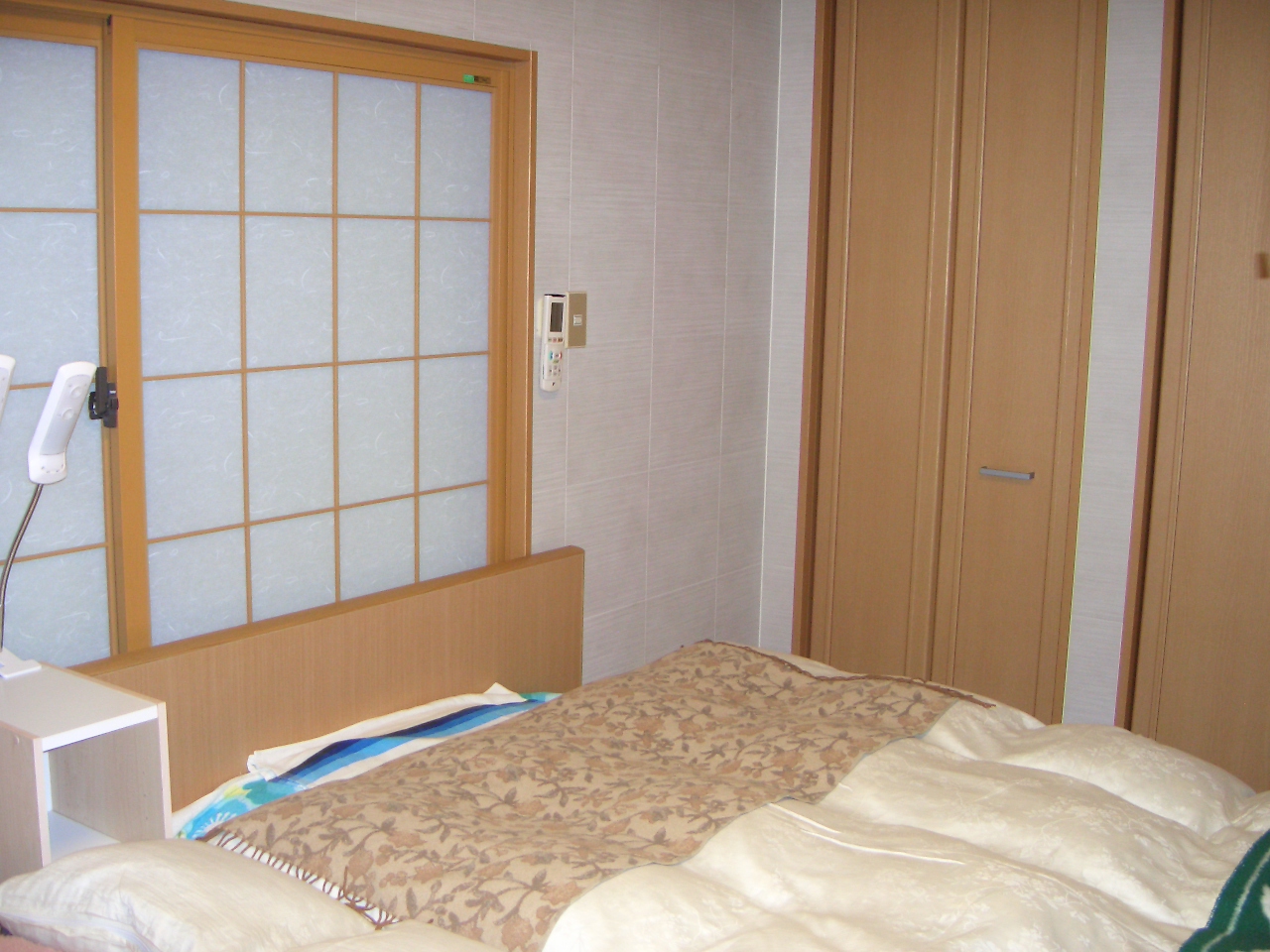 お施主様がご高齢のため、既設の和風の寝室(8畳)を洋風の寝室に改造しました。寝室から直接トイレに行けるよう寝室の壁を撤去し、既設の廊下を利用してトイレと洗面所を一体とした空間をつくりました。