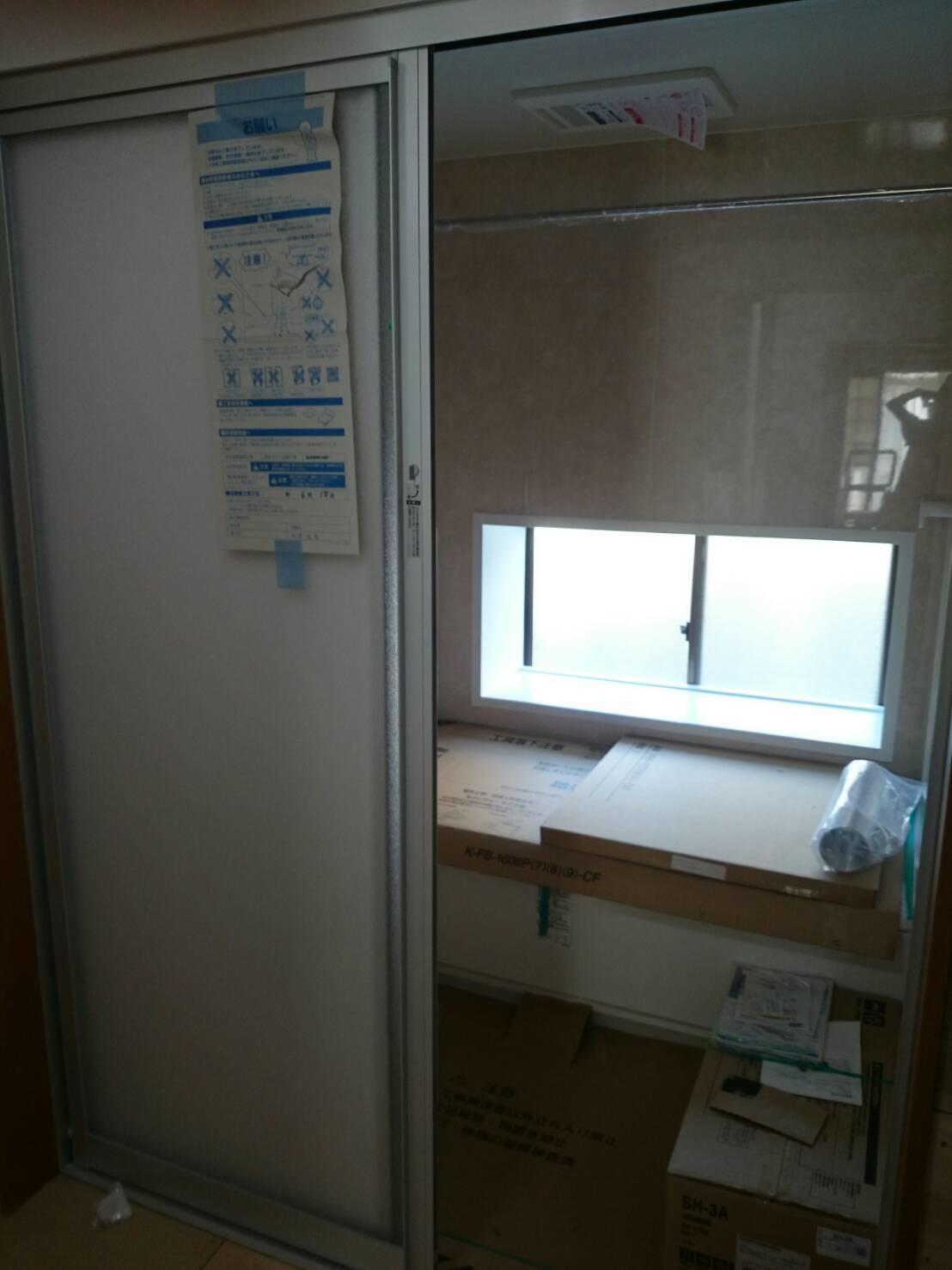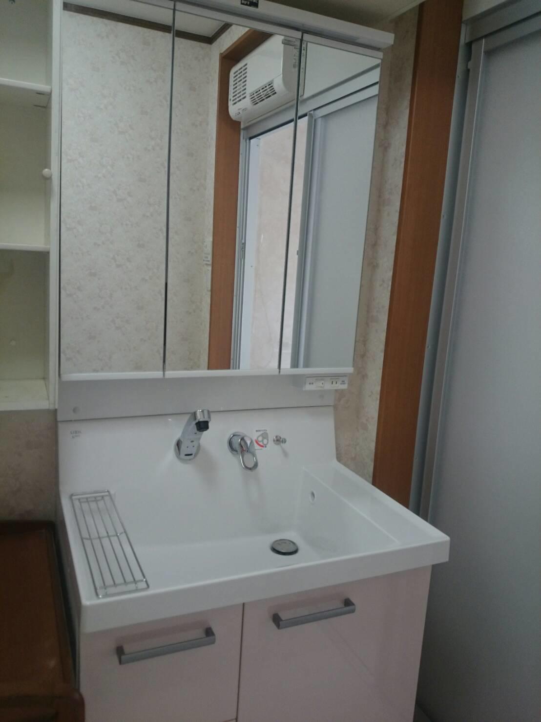 洗面化粧台 ピアラ。お掃除しやすいように鏡面仕上げの扉を選ばれました。