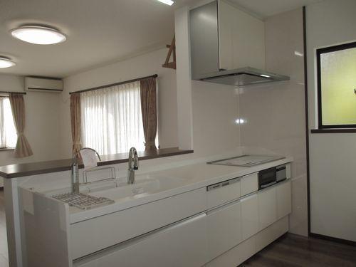 カウンター上の吊戸棚、垂れ壁を撤去して吊戸棚のないタイプのキッチンスペースとリビングを一体化しました。