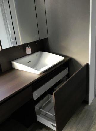 カラーは木目調、陶器製ボウルの組み合わせが高級感を感じます。 引き出し収納で奥まで手が入り効率よく使って頂けます。
