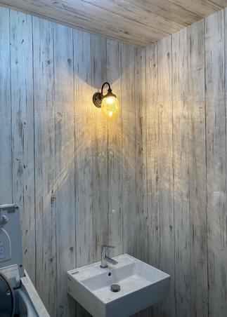洗面室はライトをアンティーク調の物にしてここもお客様の素晴らしいセンスの光ポイントでした。