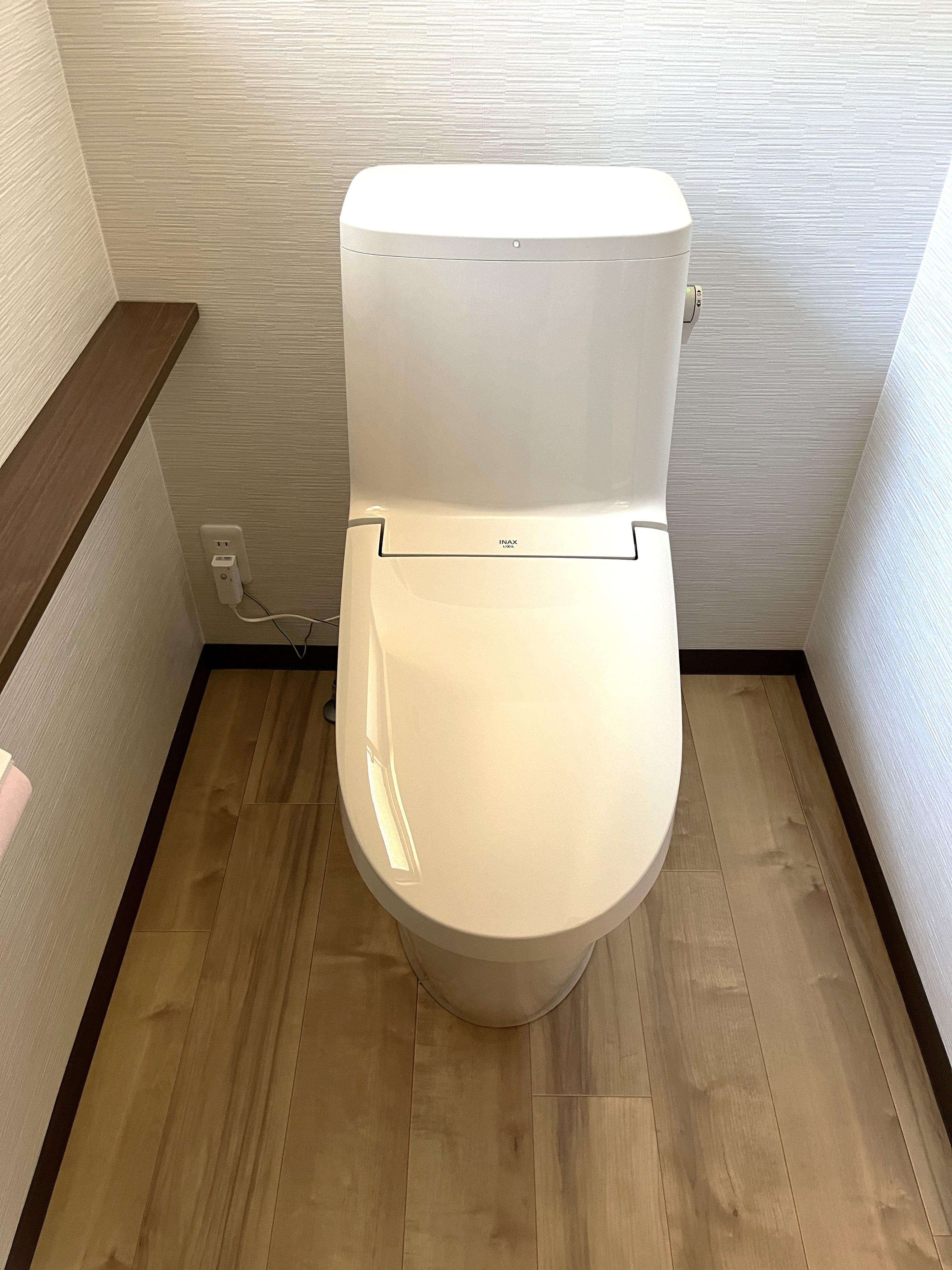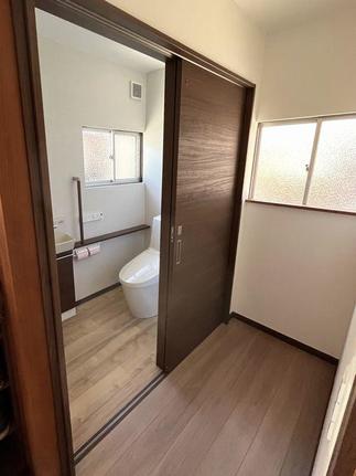 2つのトイレを1つにしたことで広くてゆったりとしたトイレスペースに なりました。 カウンター付手洗器も設置。入口の扉は引戸にし、将来の生活も想定して車いすでもスムーズに出入りが可能に。 狭くて寒いイメージだったトイレが明るく温かみのある空間にリフォームできました。