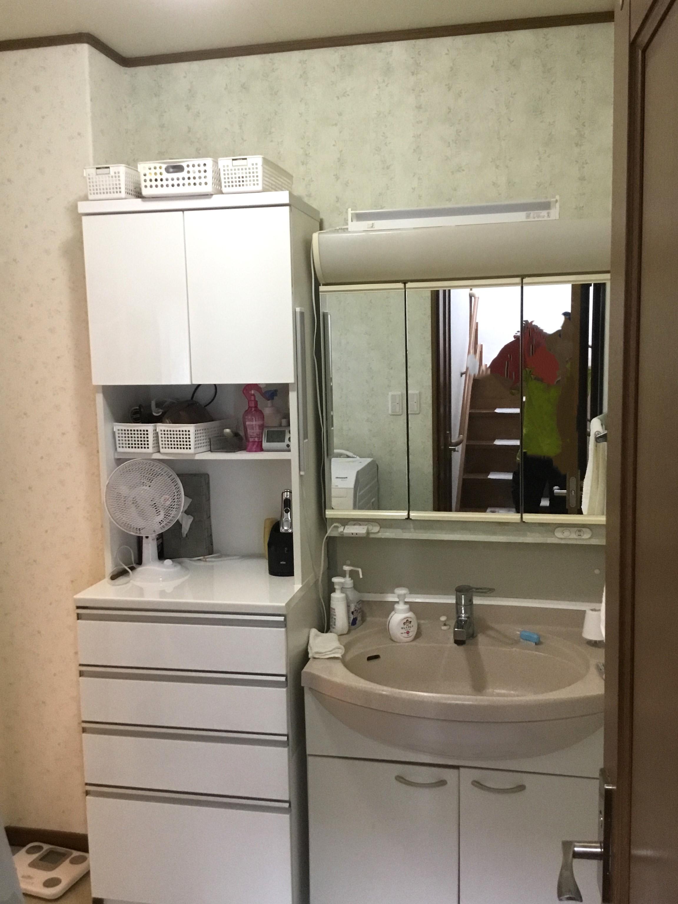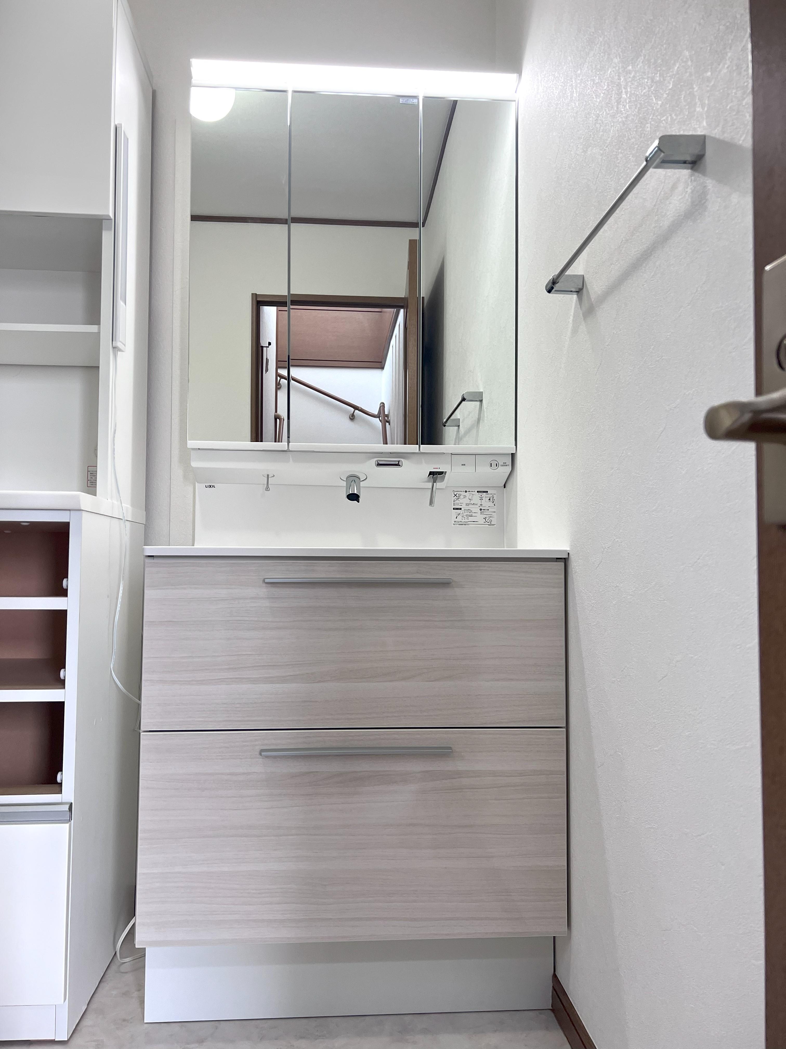 リクシル『クレヴィ』を設置させて頂きました。 自動水栓&即湯水栓でお湯がすく出て忙しい朝にはありがたい水栓。 白を基調に壁、床も一緒に新しく張り替えました。 毎日何度も使う洗面室。デザイン性も収納力も使い勝手も素敵に快適になりました。