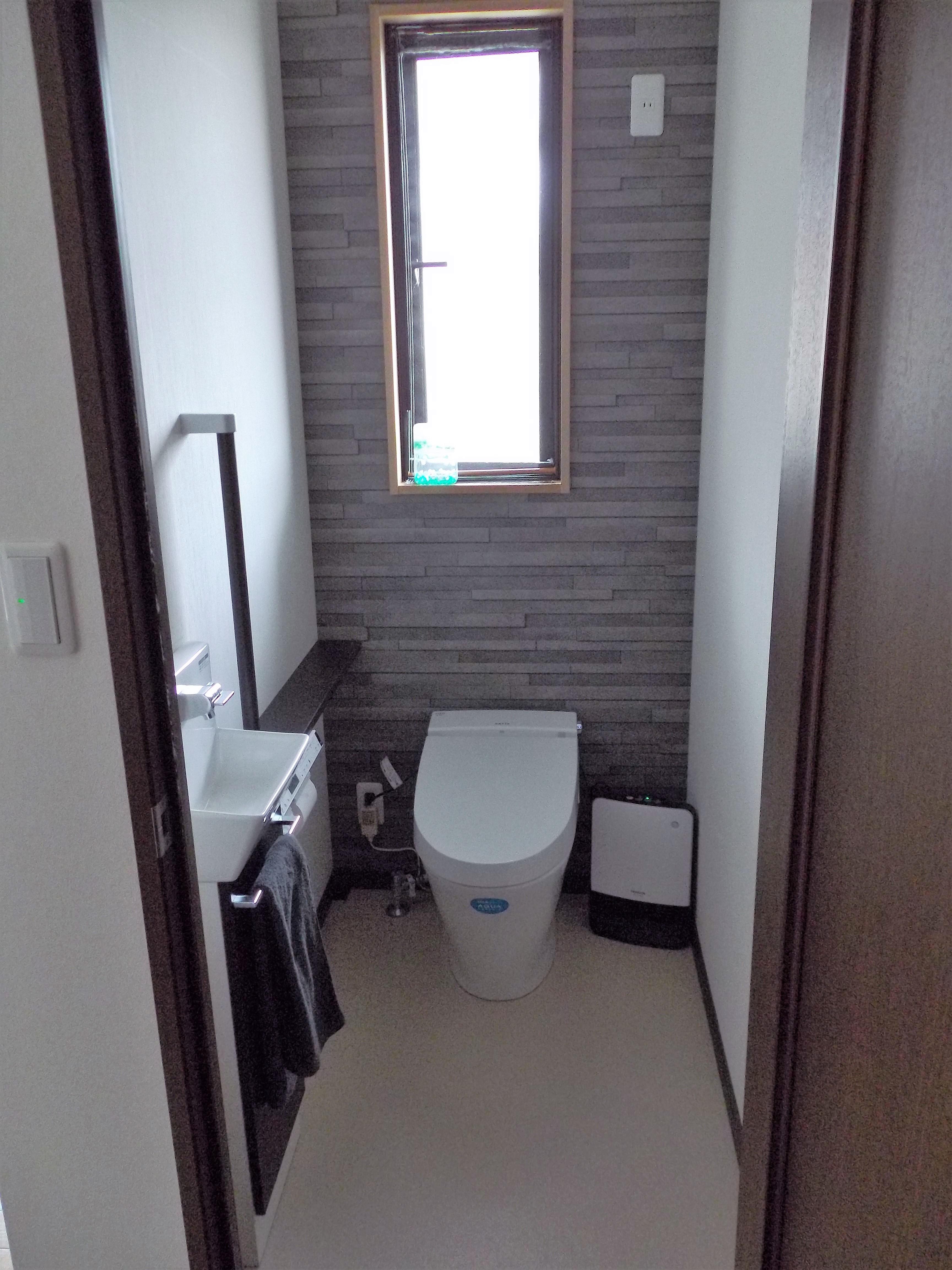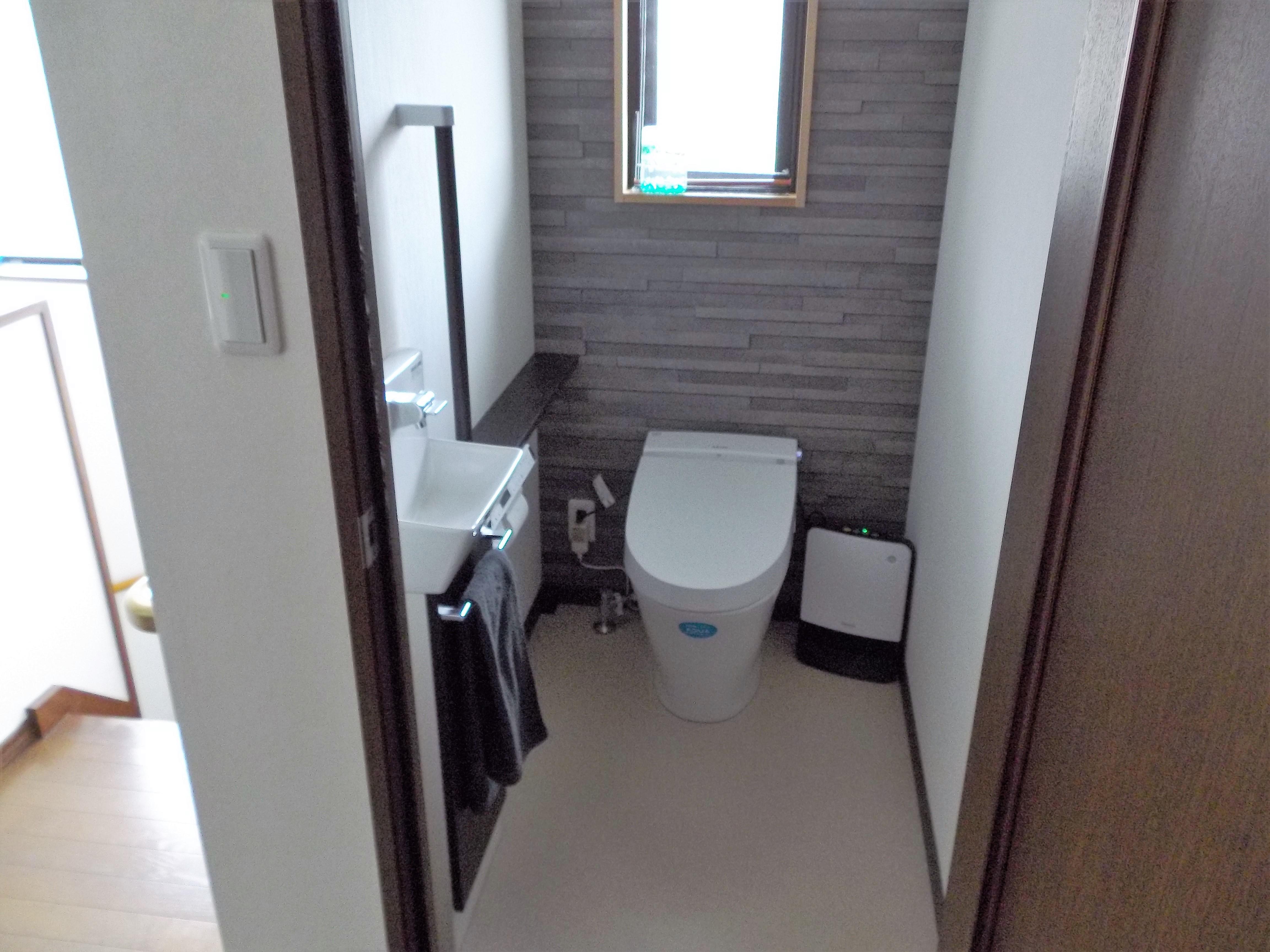 和便器から洋便器(サティス)に取替、背面にはエコカラットを貼り脱臭効果と調湿効果がありデザインもかっこいい。