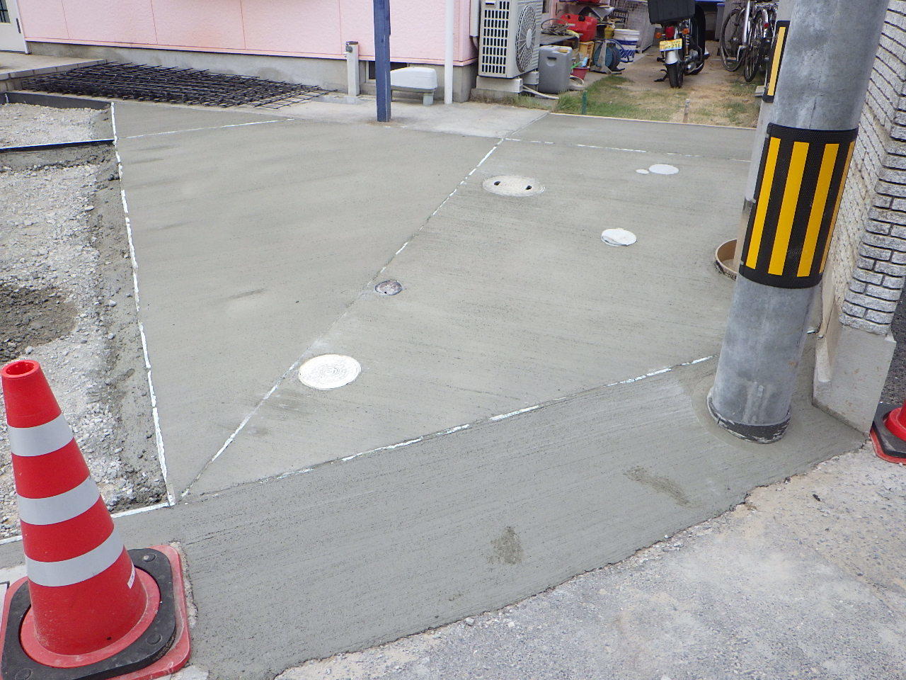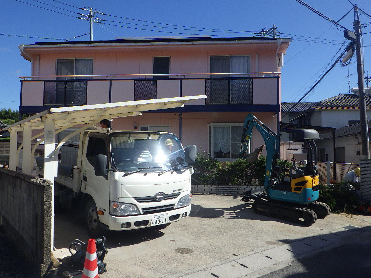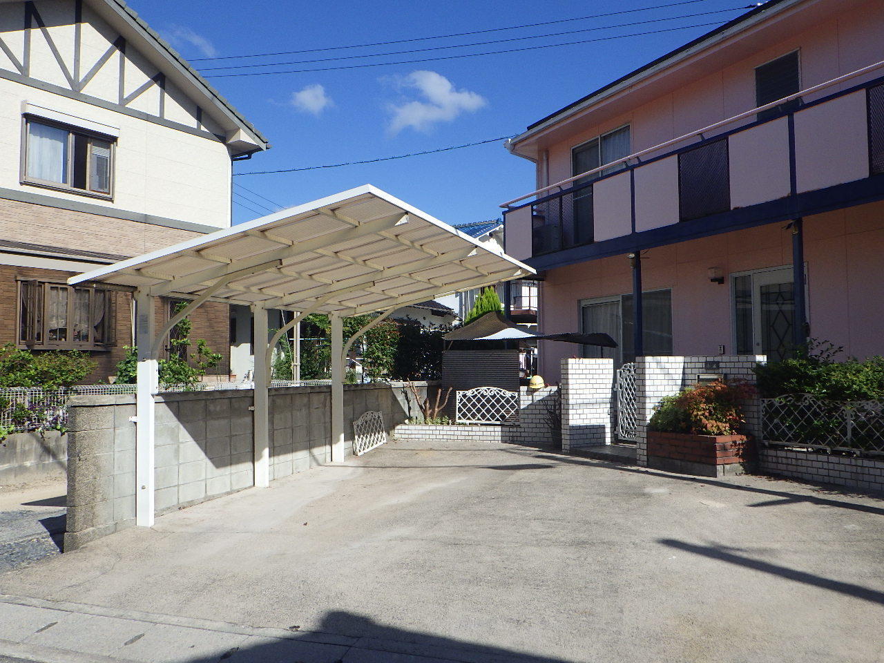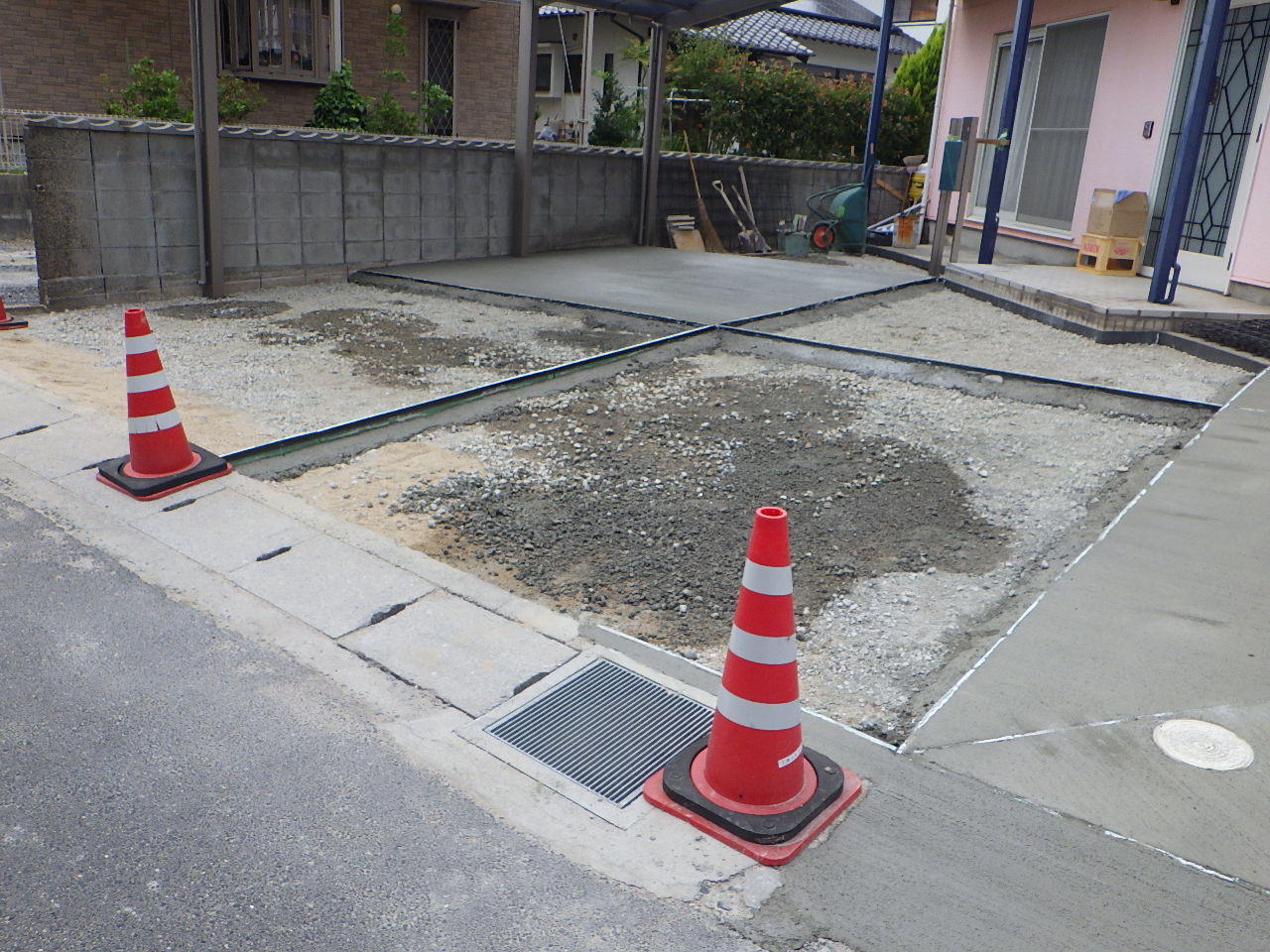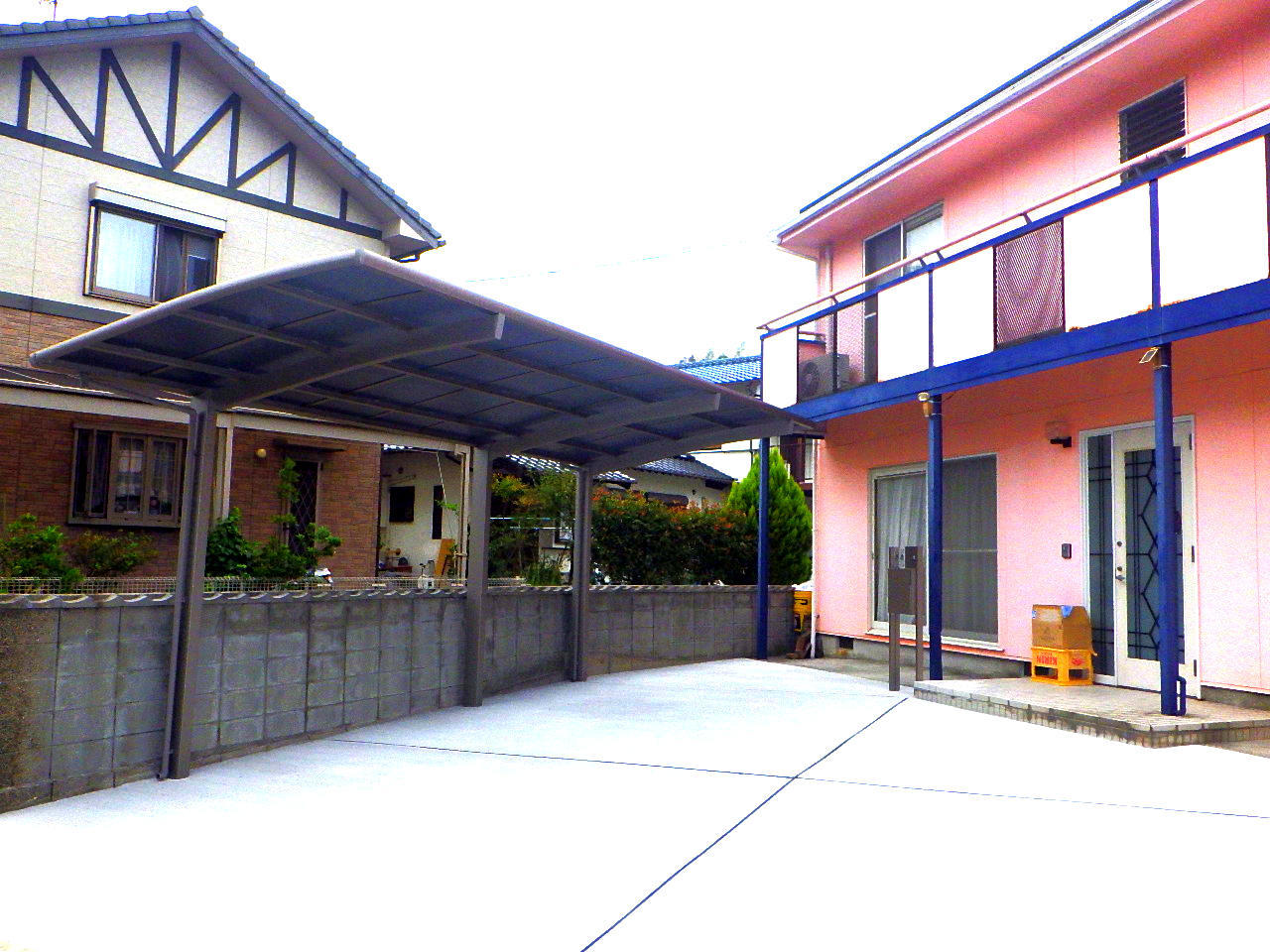 門柱撤去と土間打替えに伴って、カーポートを取り替えました。 カーポートはフーゴRレギュラーという商品で、屋根は透明なのに強度があるポリカ素材です。以前よりも落ち着いた色になり、玄関先がぐっと引き締まりました。