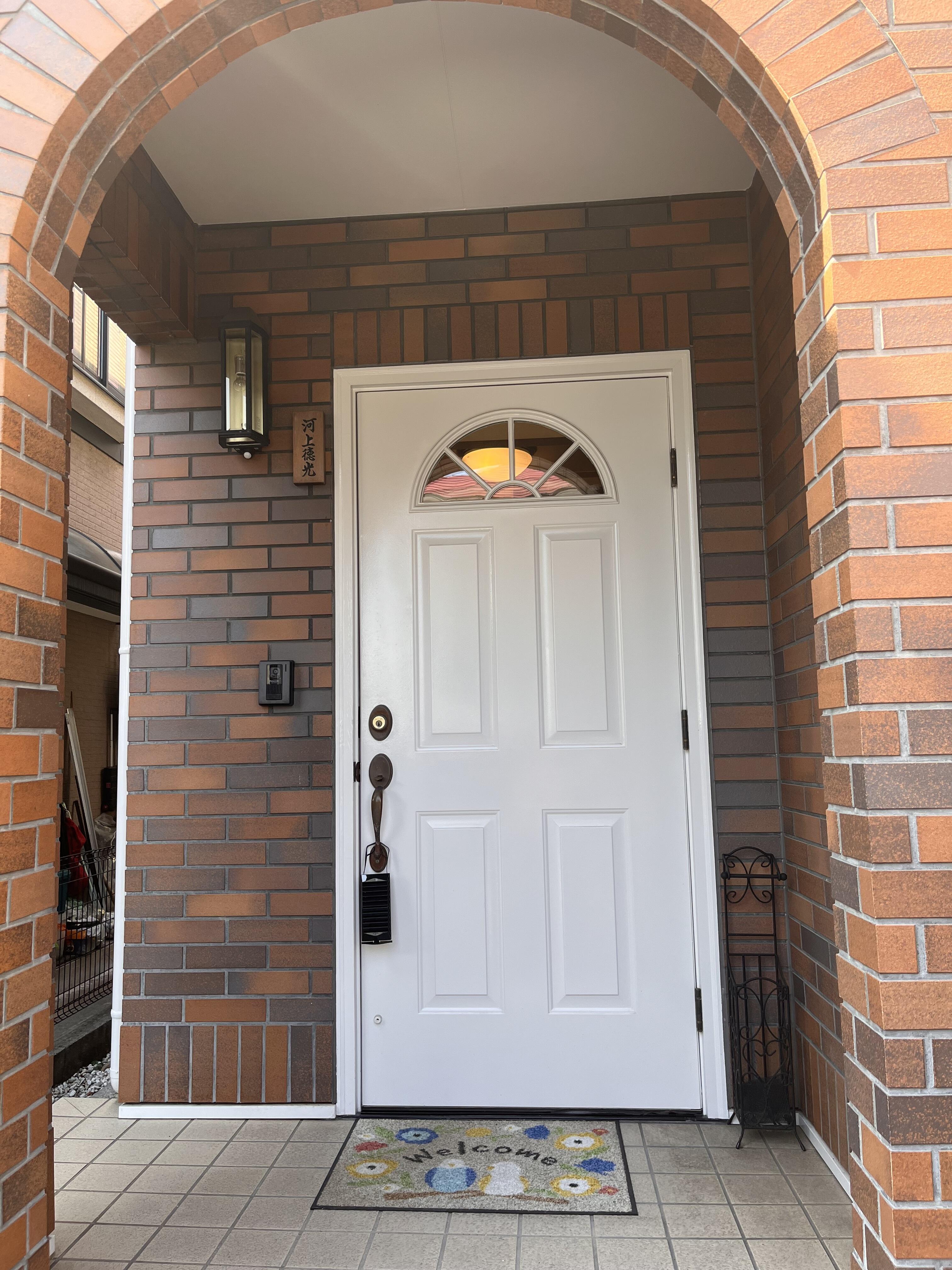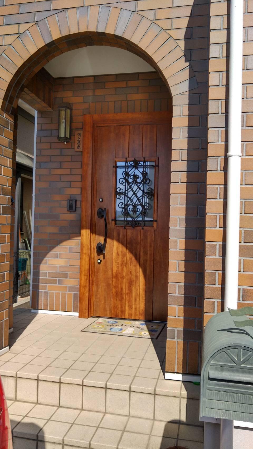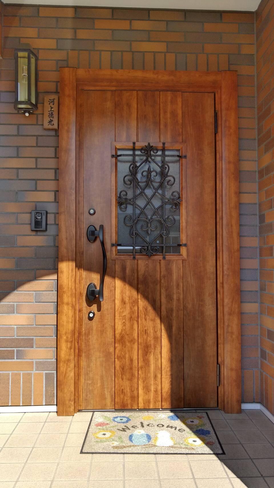 既存の白色で取替えをご要望されていましたが、ショールームへ足を運んでいただき実際の玄関扉をご覧になったうえで木目調の茶系の色に決められました。 LIXIL リシェントD41型