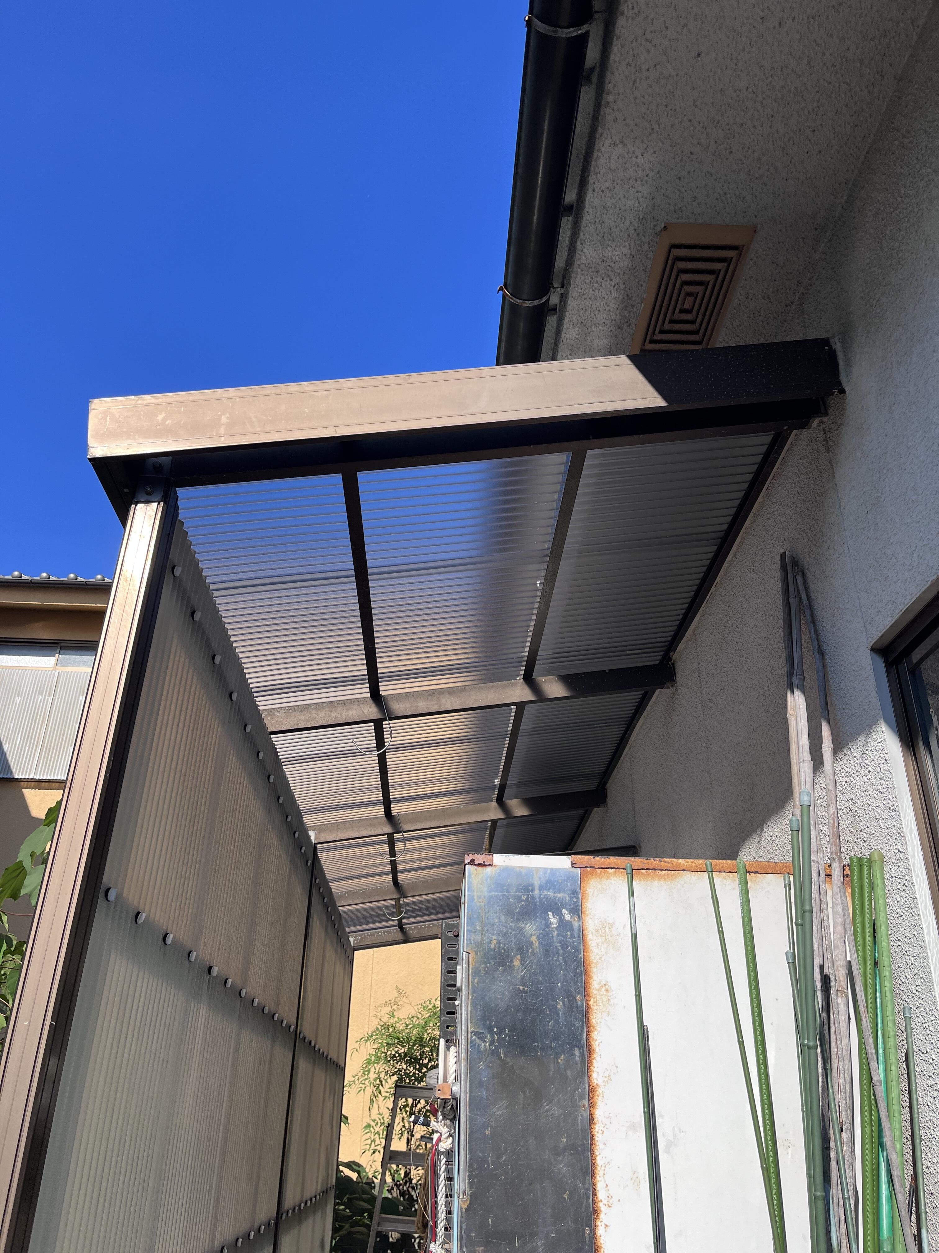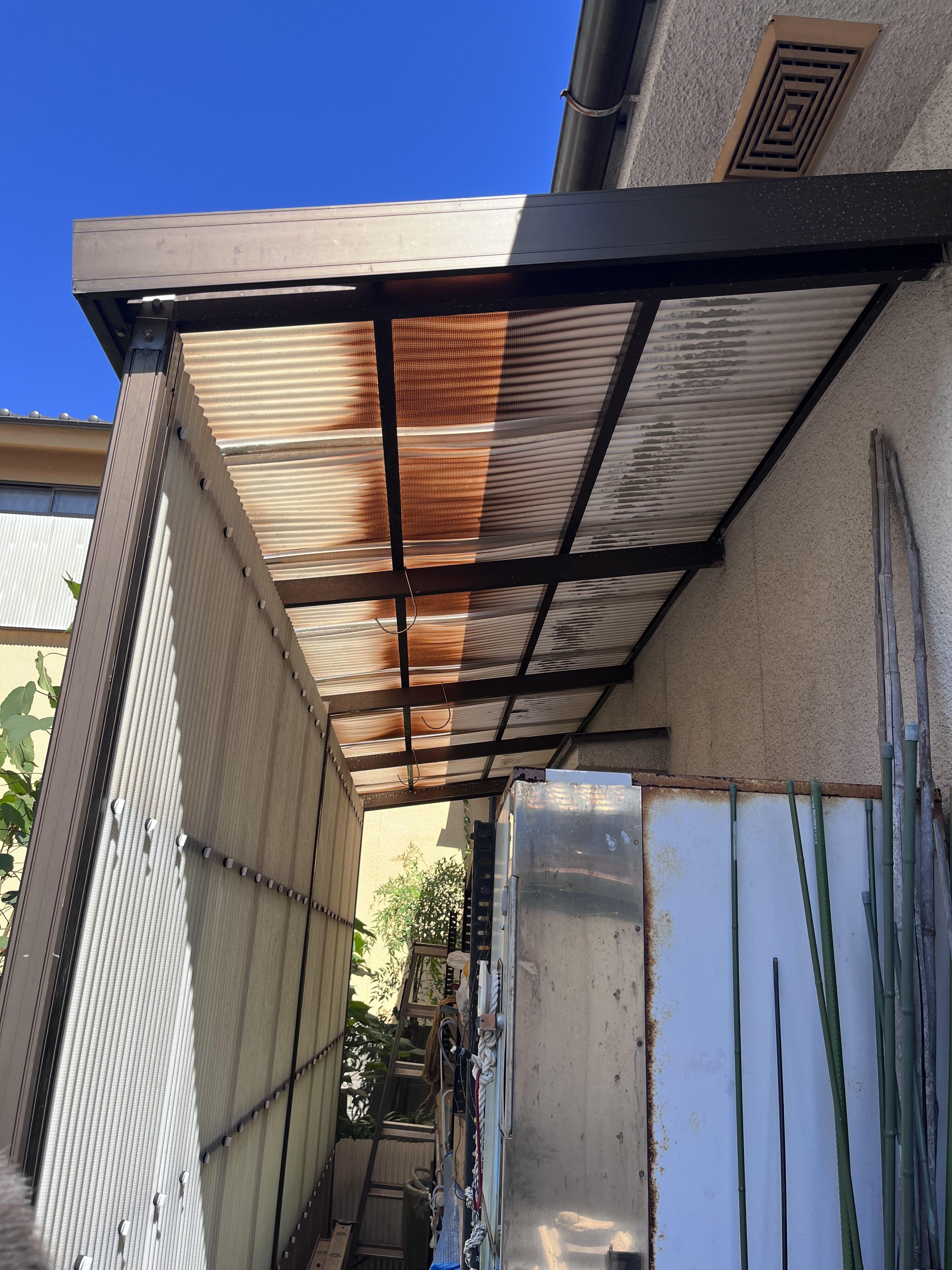 既存の波板屋根の劣化が激しかったため、熱線カット波板を張替えました。 透明で陽ざしがよく入り、熱線カットポリカで夏の暑さも和らぎます。