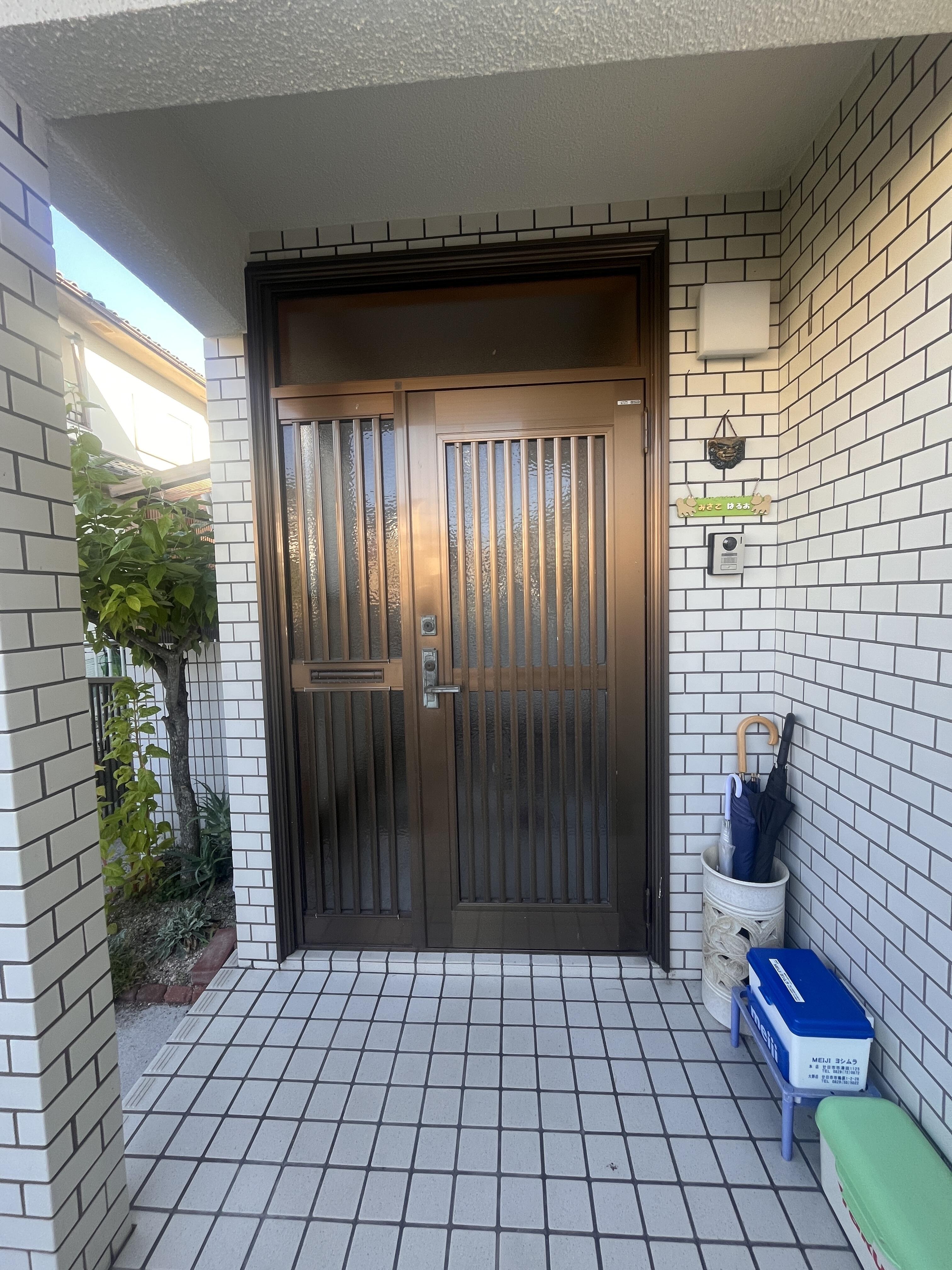 陽がよく入りこむ玄関扉を断熱仕様の扉に取替えました。 重厚感がありますね。 『リシェント M83型 ハウンドダウンチェリー』