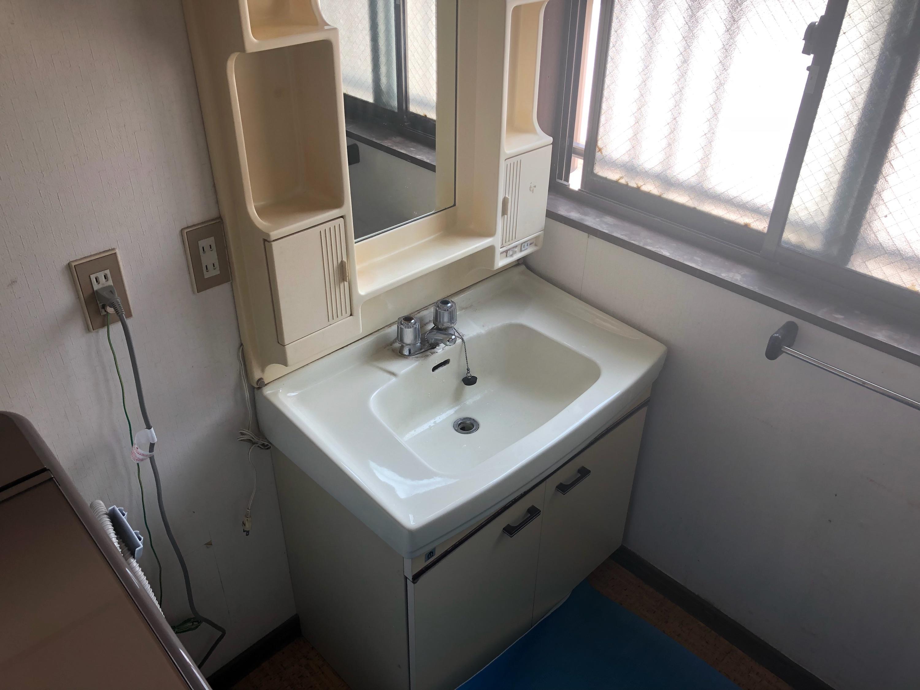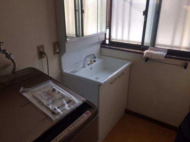 宇部市での洗面化粧台リフォームです。古くなり使い勝手も悪くなったので取替をご希望。デザイン・収納面ともに良くなった、とお喜びいただきました。