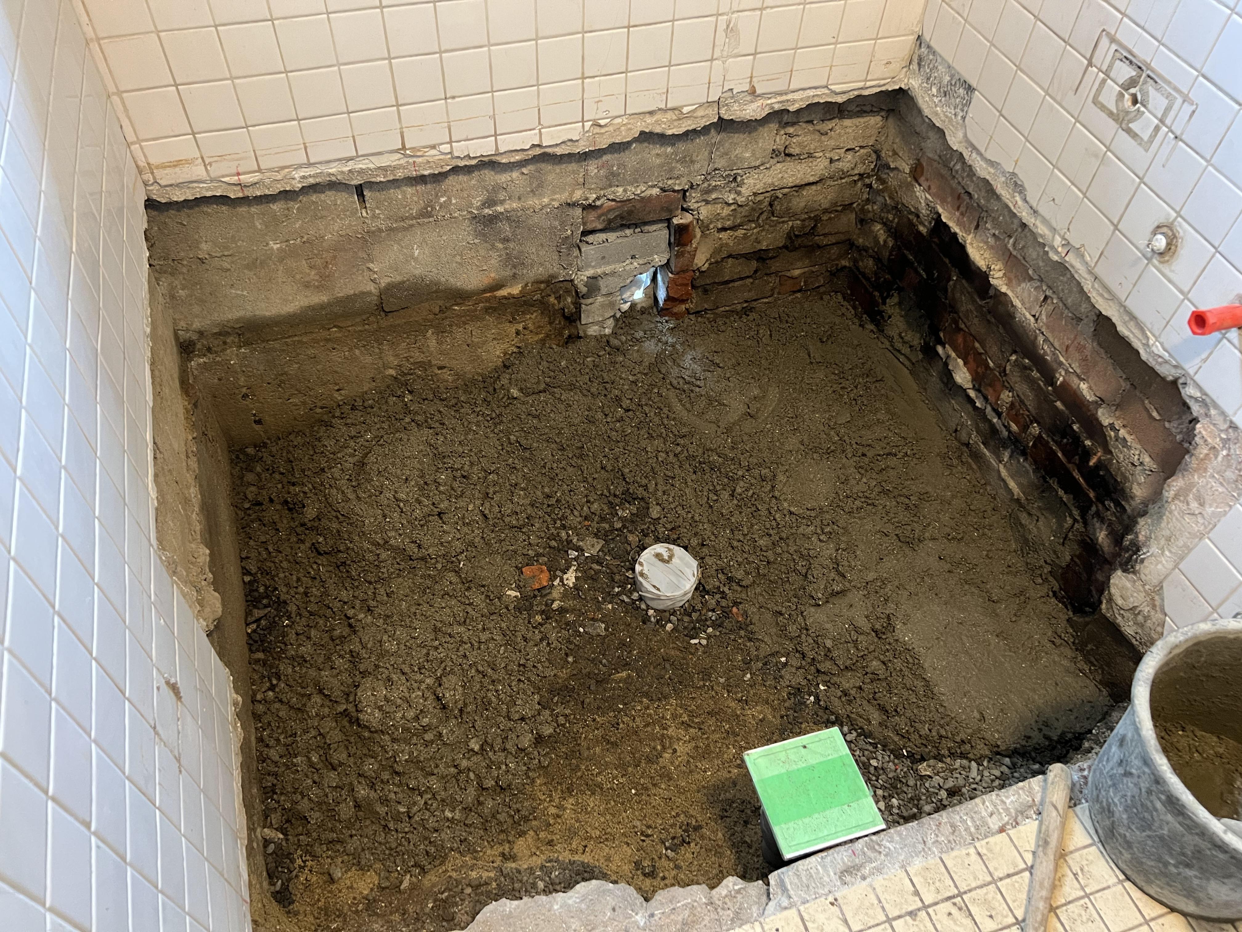 浴槽と洗い場の排水を取り直します。その後、土間打ちをして浴槽が置けるようにします。