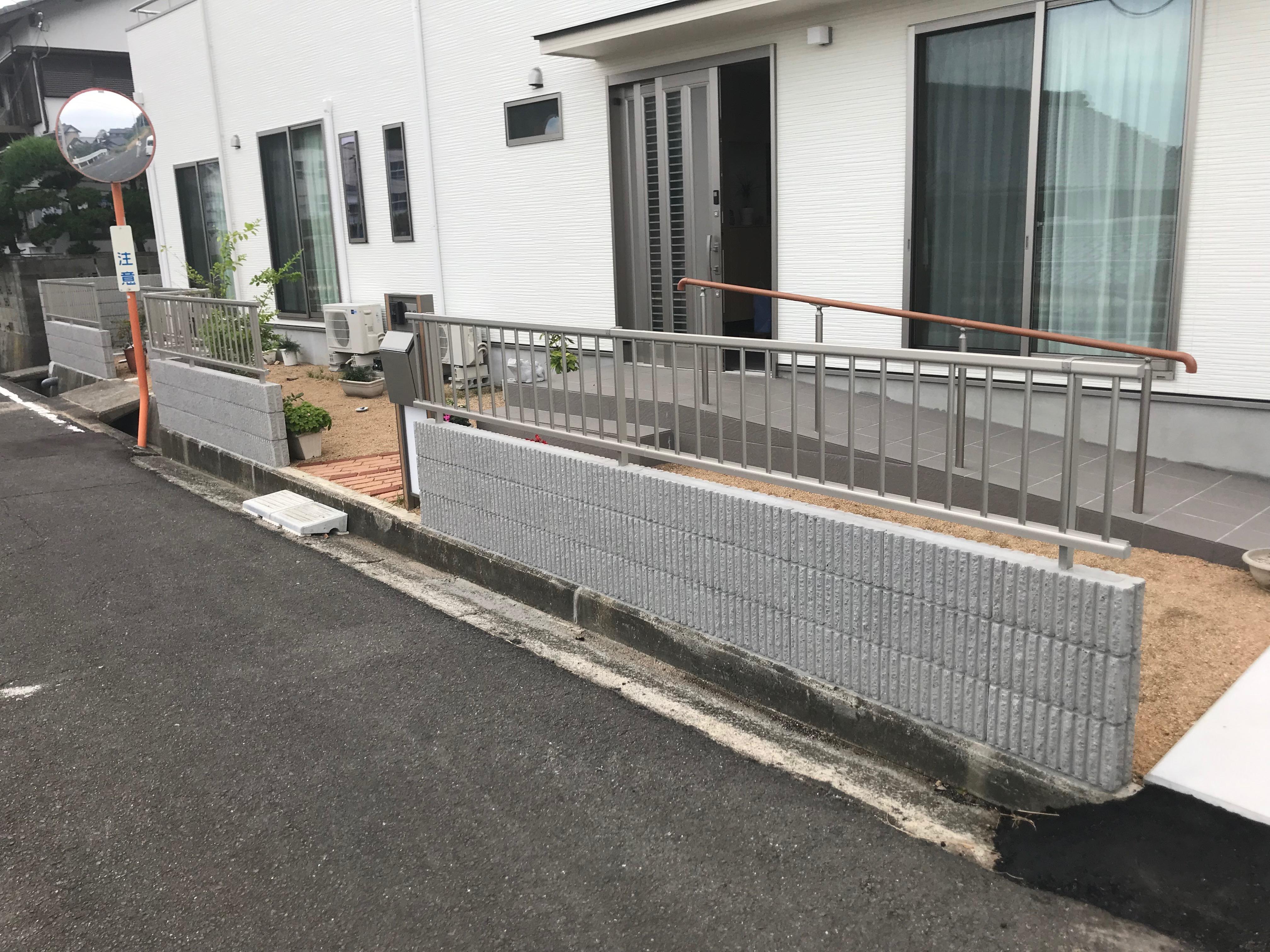 玄関からバリアフリーのスロープと手摺を、メンテナンス不要のフェンスで仕上げました。