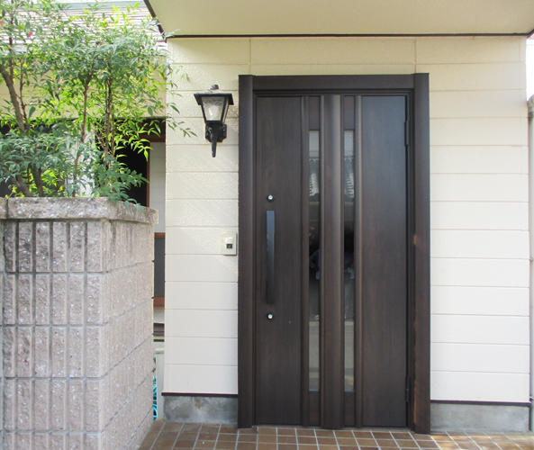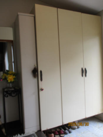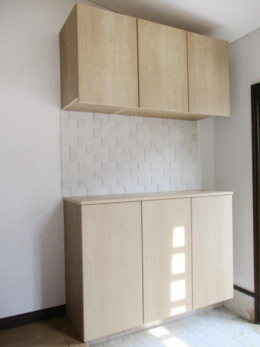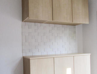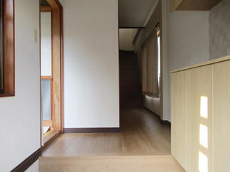 玄関ドア取り替えのついでに 玄関収納、廊下のフローリングもまとめてリフォームいたしました。 玄関まわりが明るく、 また以前より広く感じられるようになりました。 収納の中央には、いやな臭いや湿気を抑える 壁材エコカラットを設置しました。
