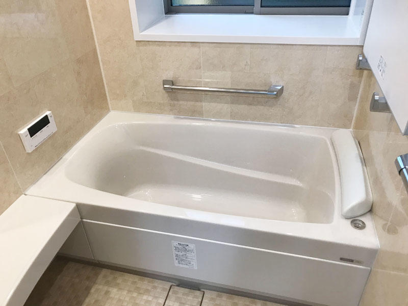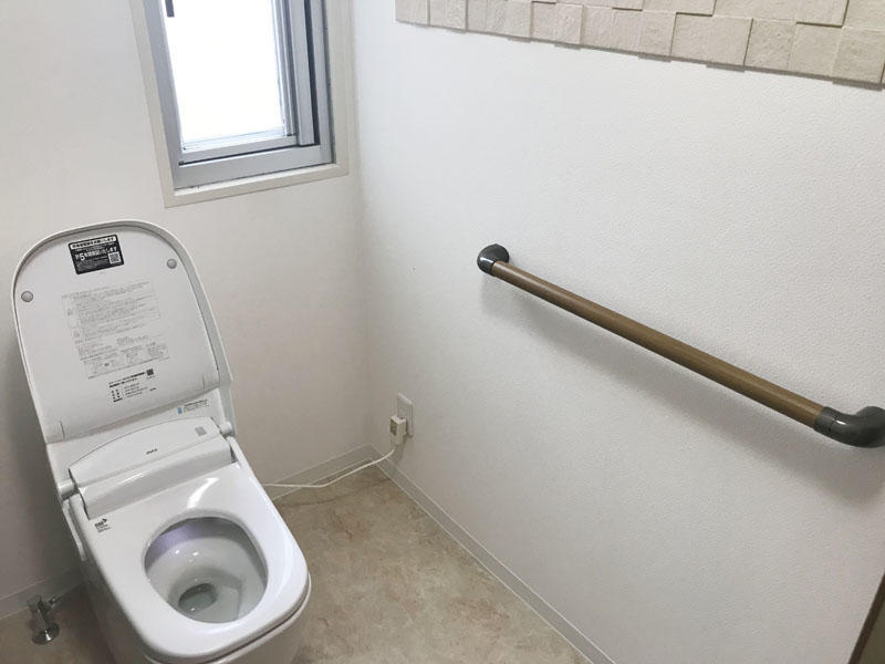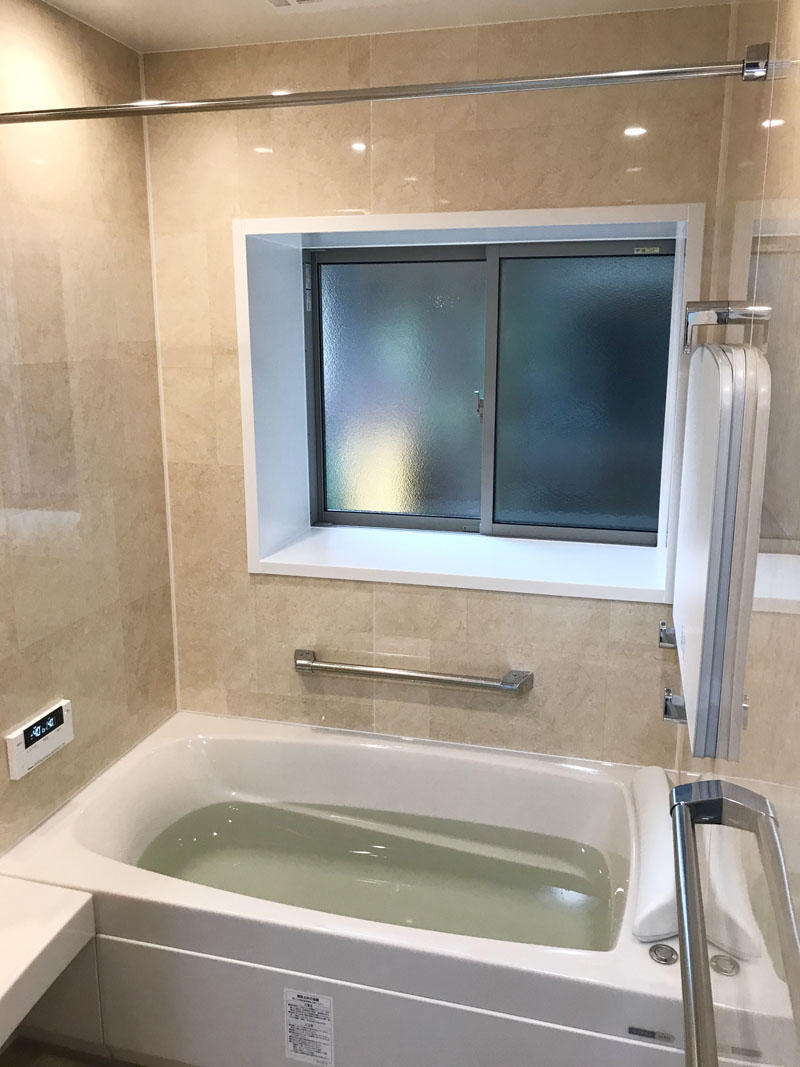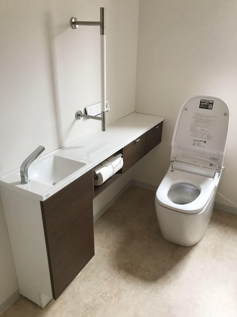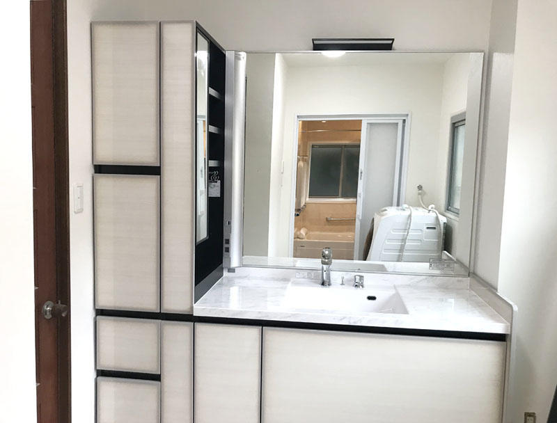 ホテルのような洗練された洗面空間を演出してくれる化粧洗面台「ルミシス」を設置。 トイレ、お風呂もバリアフリー仕様になっております。 加湿も除湿もいやなにおいもとってくれるデザイン壁材・エコカラットで生活がより快適な空間になりました。