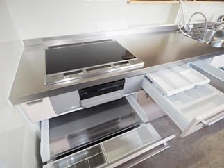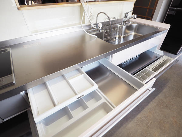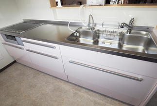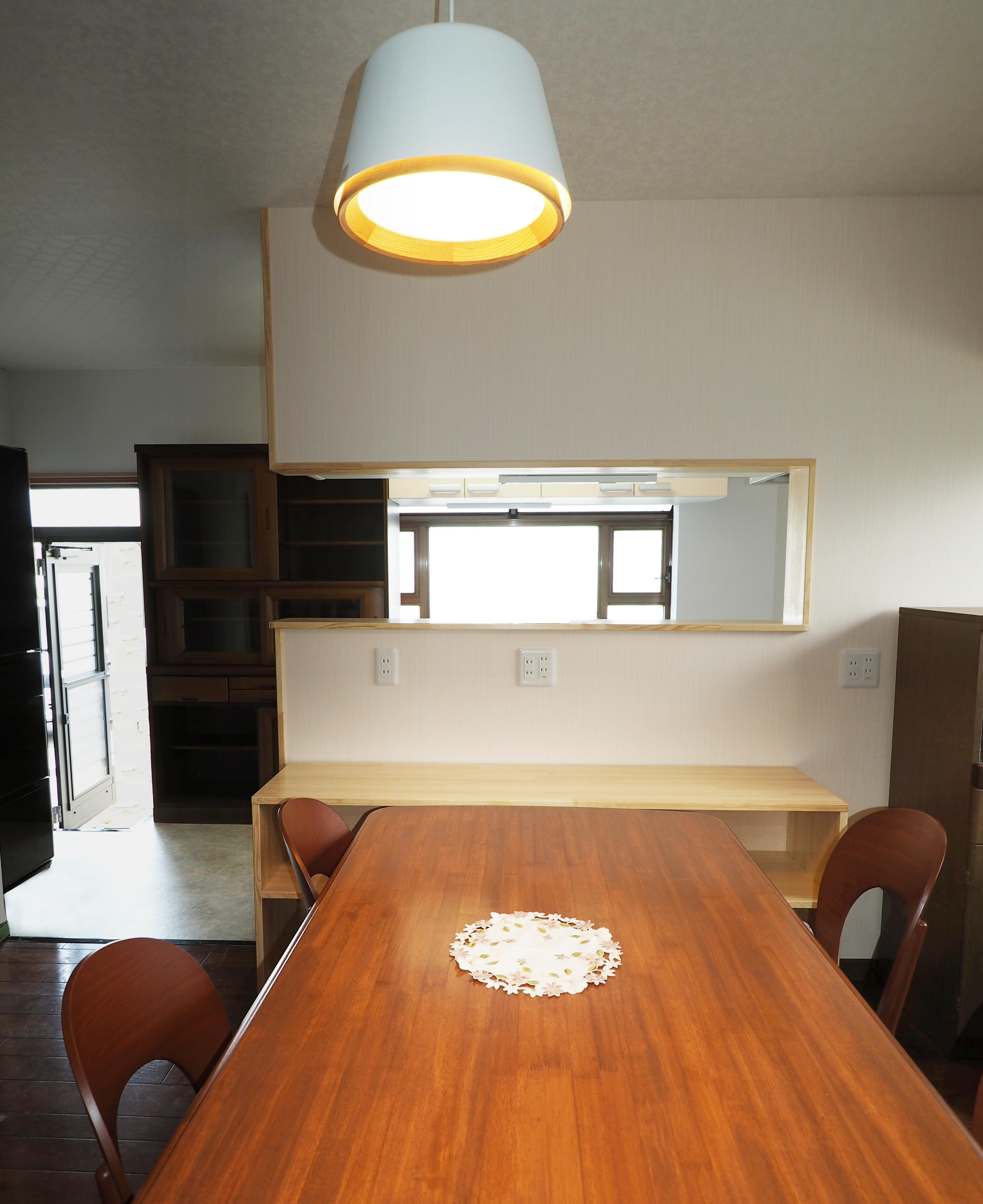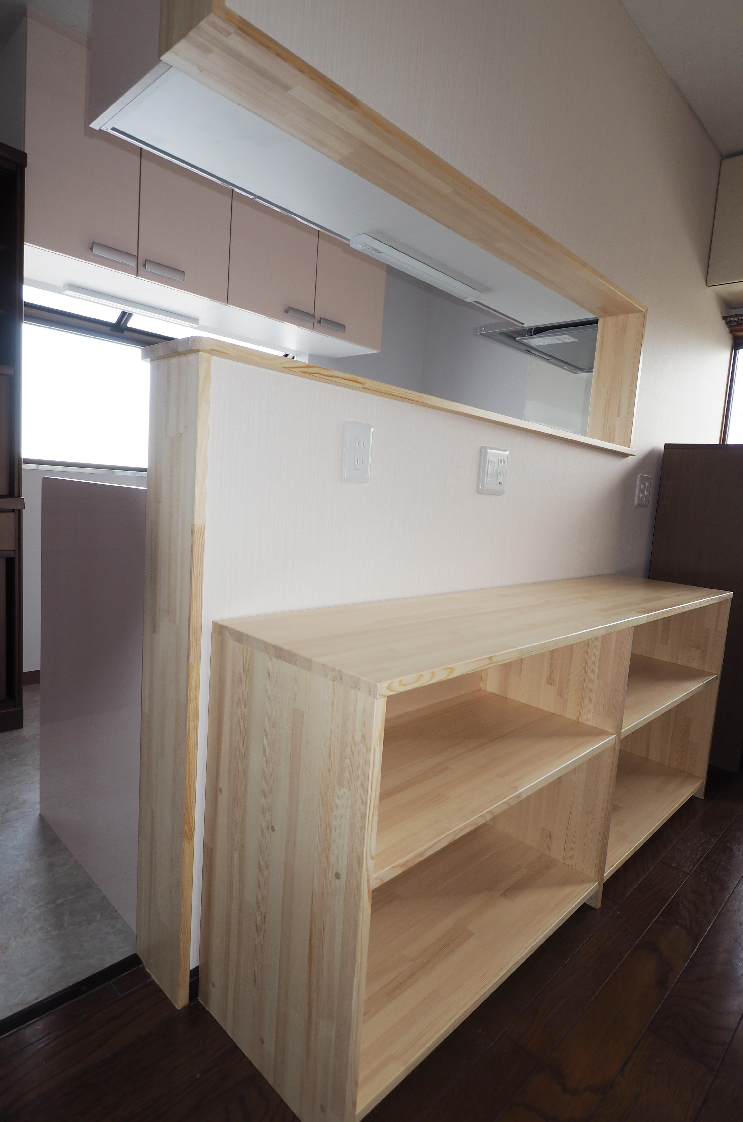 対面キッチンを導入したことで、ご要望だったお母様だけのキッチンスペースが確保されました。 大工さんの手作りの棚の上にポットやレンジを設置し、 リビングからはご家族の方でも暖かい食べ物や飲み物をとることができます。 キッチンのほどよいピンクカラーが新しく生まれ変わった壁紙にもよく馴染んでいます。