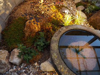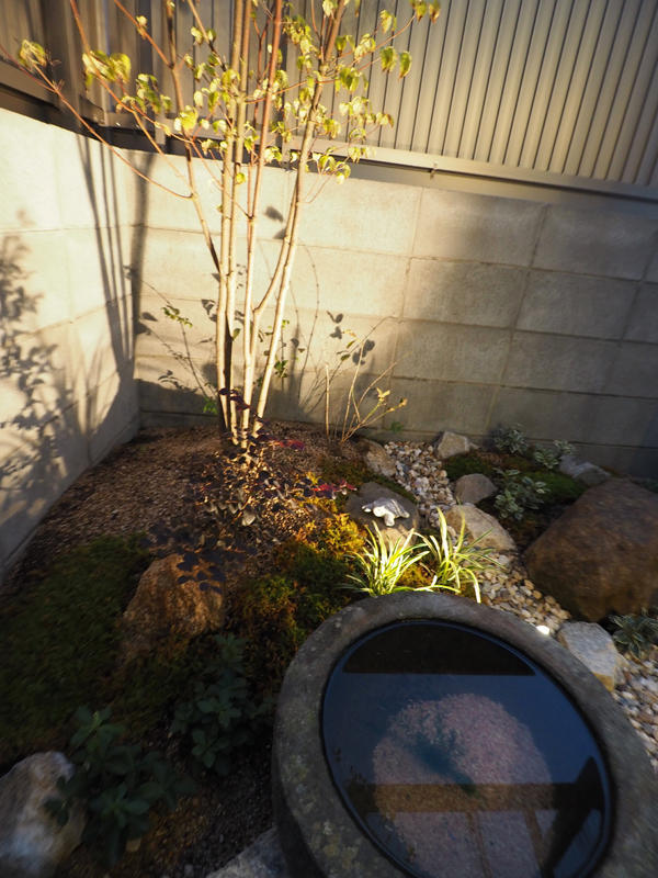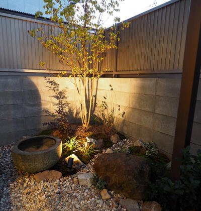 フェンス取り付けとあわせてお庭スペースの一角に 坪庭を造りました。 樹木のライトアップで、秋の夜長を楽しめる空間になりました。