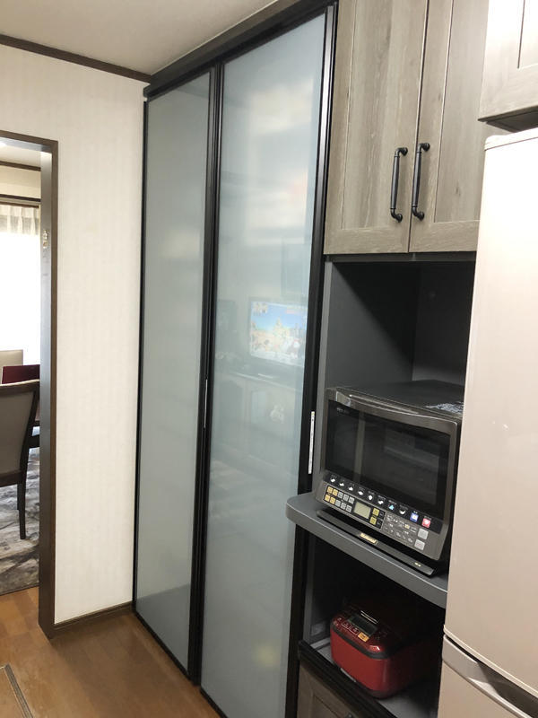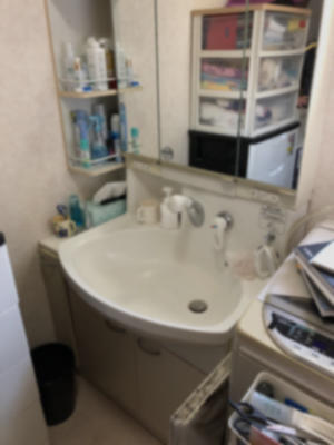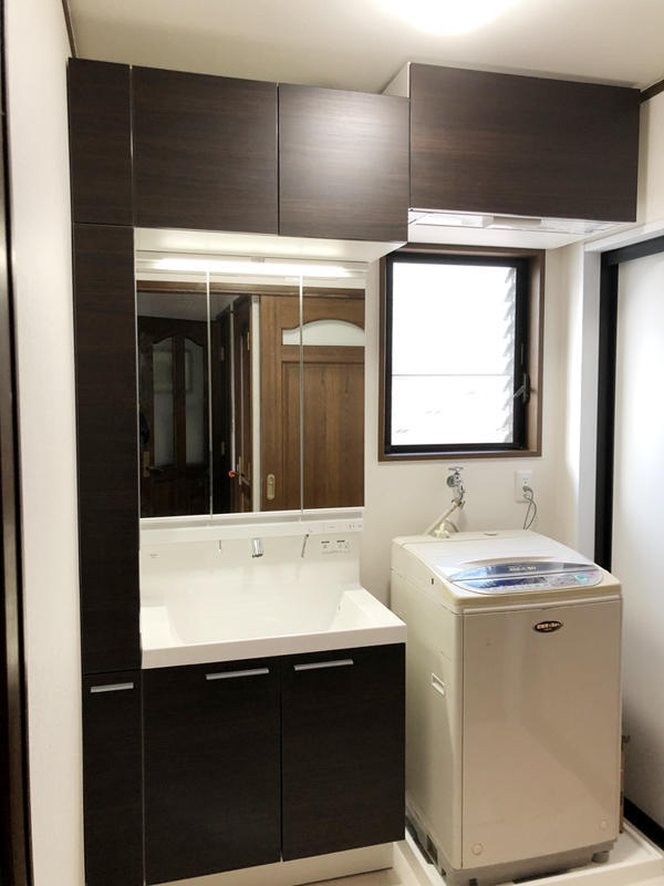 収納たっぷりの化粧洗面台に入れ替え、 見た目もすっきりしました。 ダークブラウンカラーで高級感も出ています。