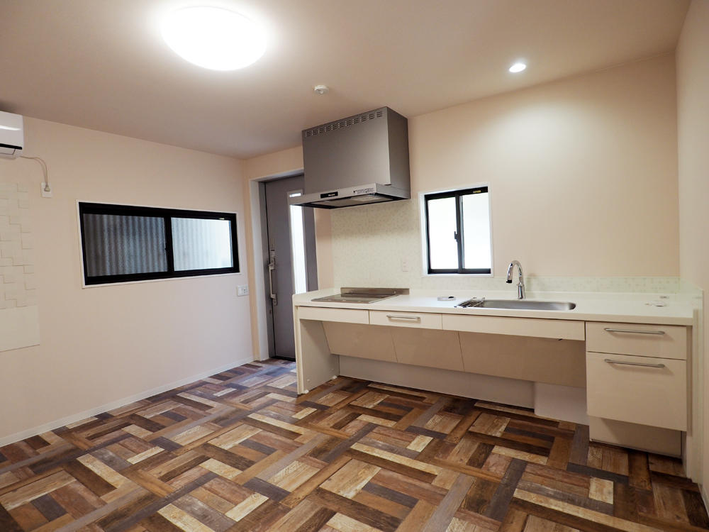 キッチンからはリモコンひとつで自動開閉できる勝手口を設置。