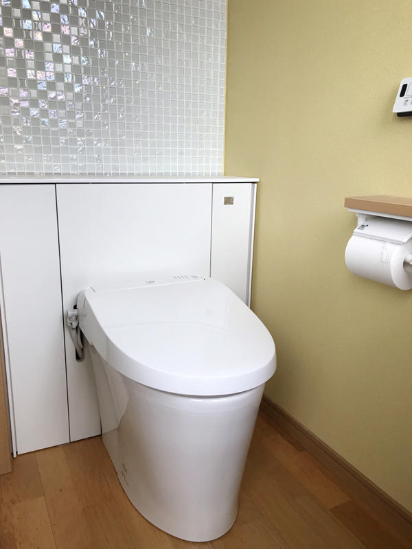 収納付きのトイレ交換を行いました。 内装にもこだわり、背面にはタイルを貼り 明るくおしゃれな空間になりました。