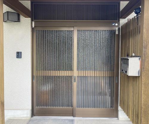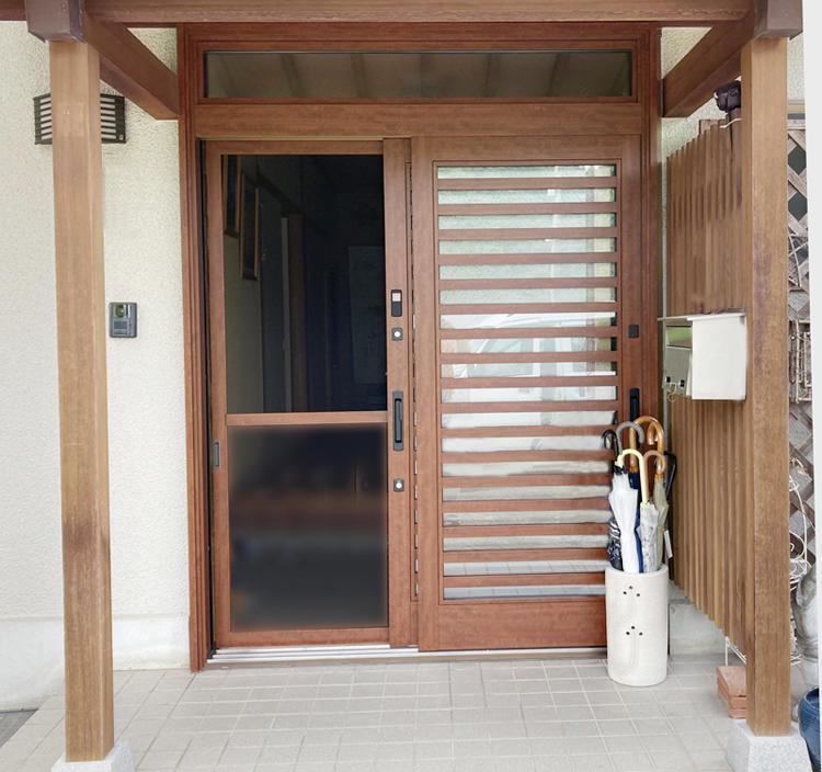 玄関引き戸の入れ替えを行いました。 網戸付きで換気ができ、 またタッチキーのオプションをつけたことにより、 ボタンを押すだけで施錠も開錠も簡単にできます。