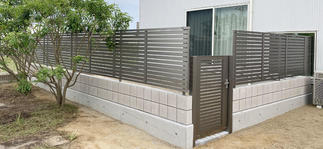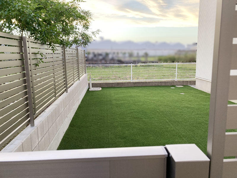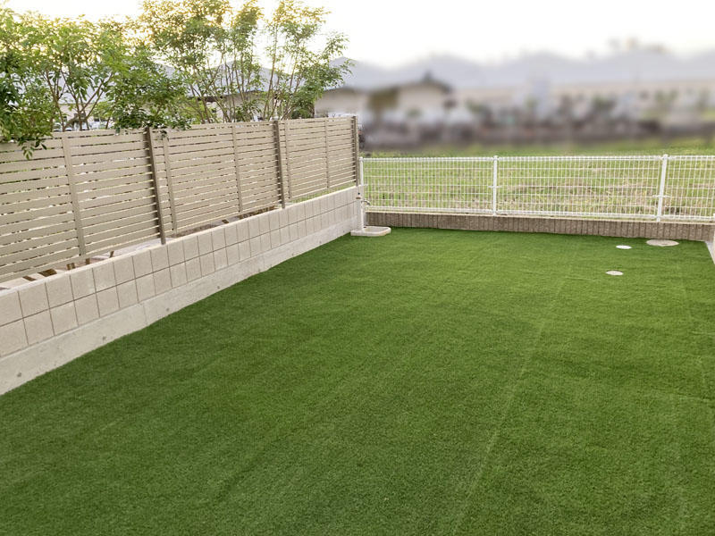 フェンス、門扉で庭一面を囲み愛犬を安心して放し飼いできるようにしました。 人口芝はとても耐久性が高く水はけも良いので、屋外でも長い間キレイな状態を保ってくれます。