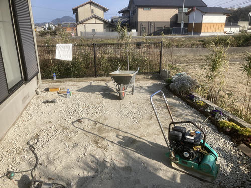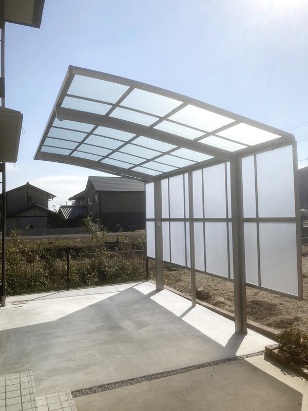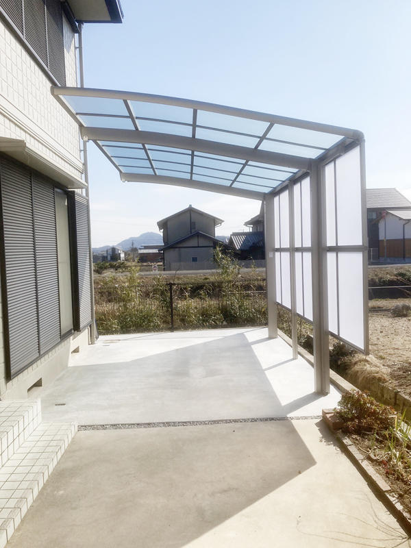 元々あったレンガを撤去、コンクリートを敷き詰め、 リクシルのカーポート「ネスカR」を設置しました。 サイドパネルを付けることで、 横なぐりの雨や風から車を守り、また、隣地などからの視線を遮ります。