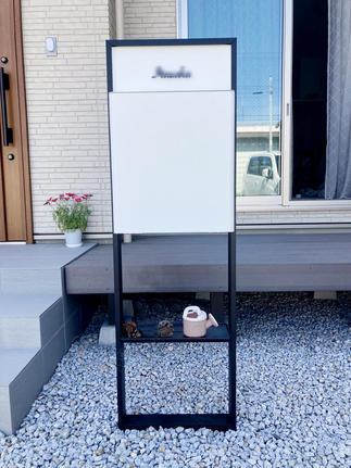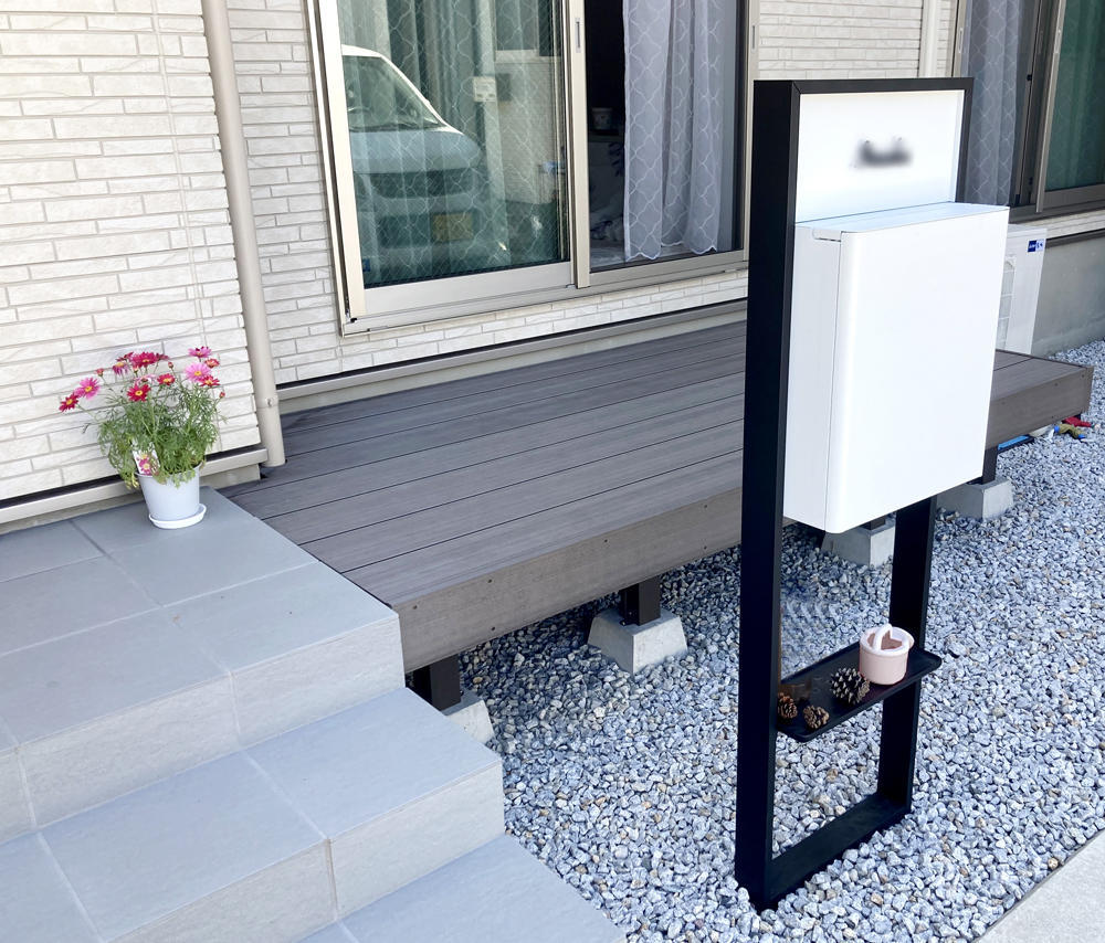 シンプルな佇まいでさりげない個性を演出してくれる宅配ボックス。 スマートなシルエットのデザインでお庭のアクセントにもなっています。 その後ろには、ウッドデッキを取り付けおうち時間を楽しめます。