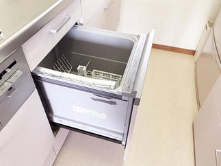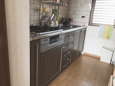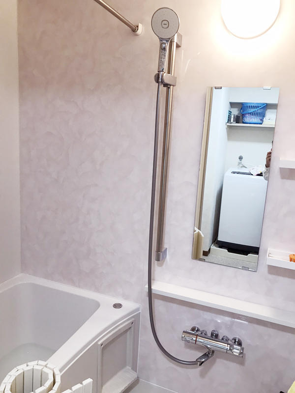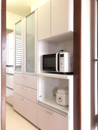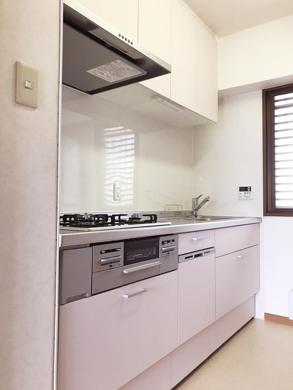 キッチン、お風呂ともに薄いピンクカラーを搭載し、 優しく温かみのある空間を実現できました。 キッチン本体と同じキッチン収納も設置したことで統一感ができました。