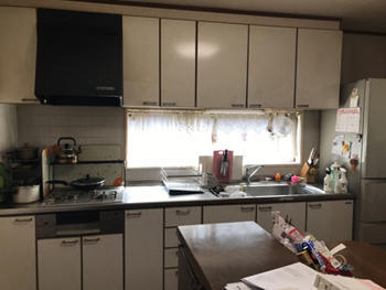 取り出しやすく、しまいやすい、たっぷり入る大容量の収納の システムキッチンに交換を行いました。 天板は熱・キズ・汚れに優れた耐久性を発揮する 高級感のあるセラミックトップを採用しました。