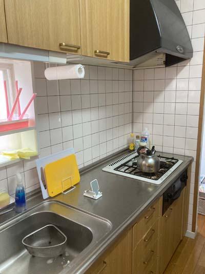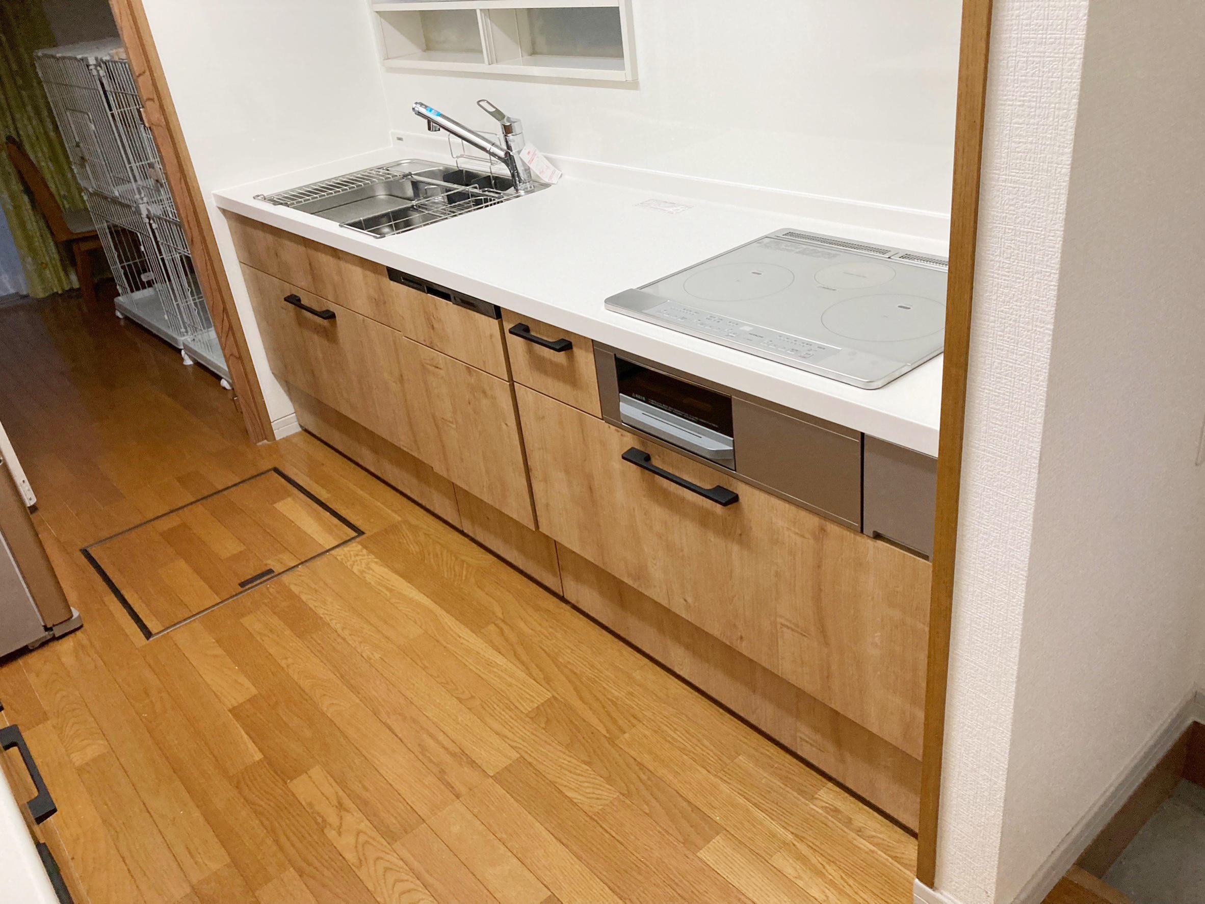 既存のフローリングになじむ木目柄のキッチン。 チェック柄のクロスが可愛らしい雰囲気を出しています。