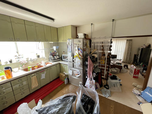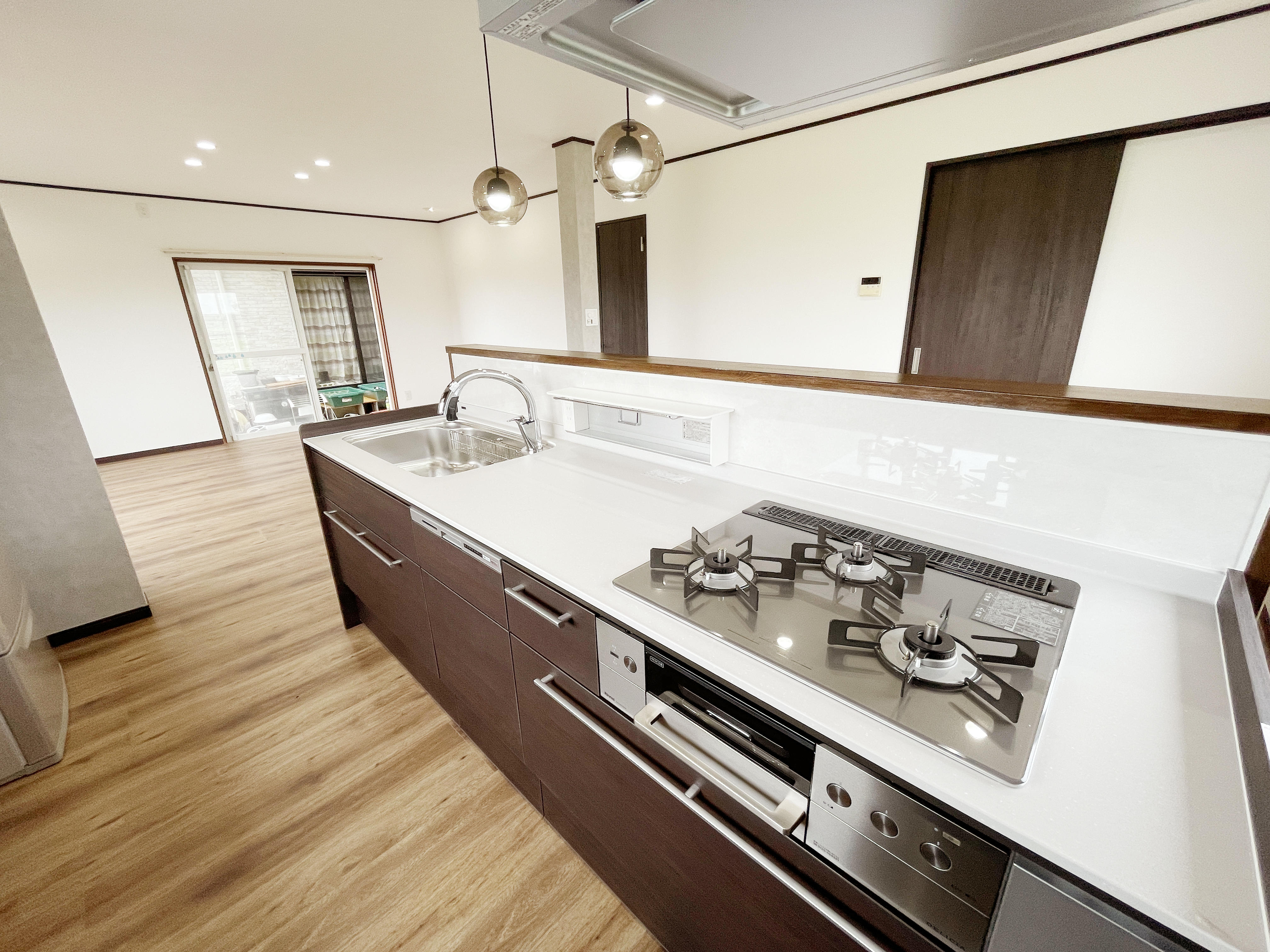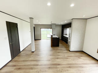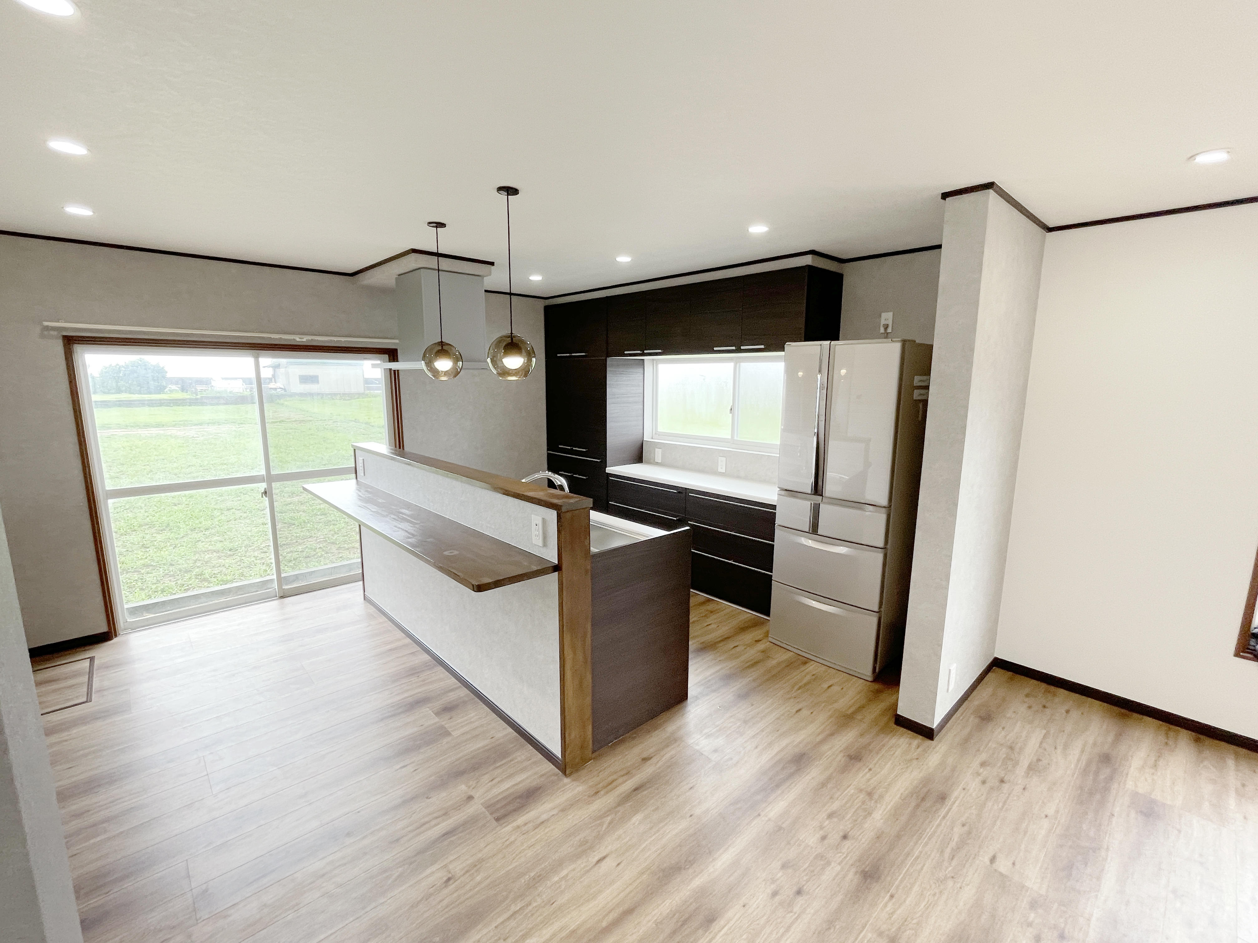 二部屋が一部屋になり開放的な間取りを実現したリノベーション。 キッチンからの視界が抜けるようになり、広々とした空間となりました。 ダーク色を取り入れたことによりモダンな仕上がりになっています。