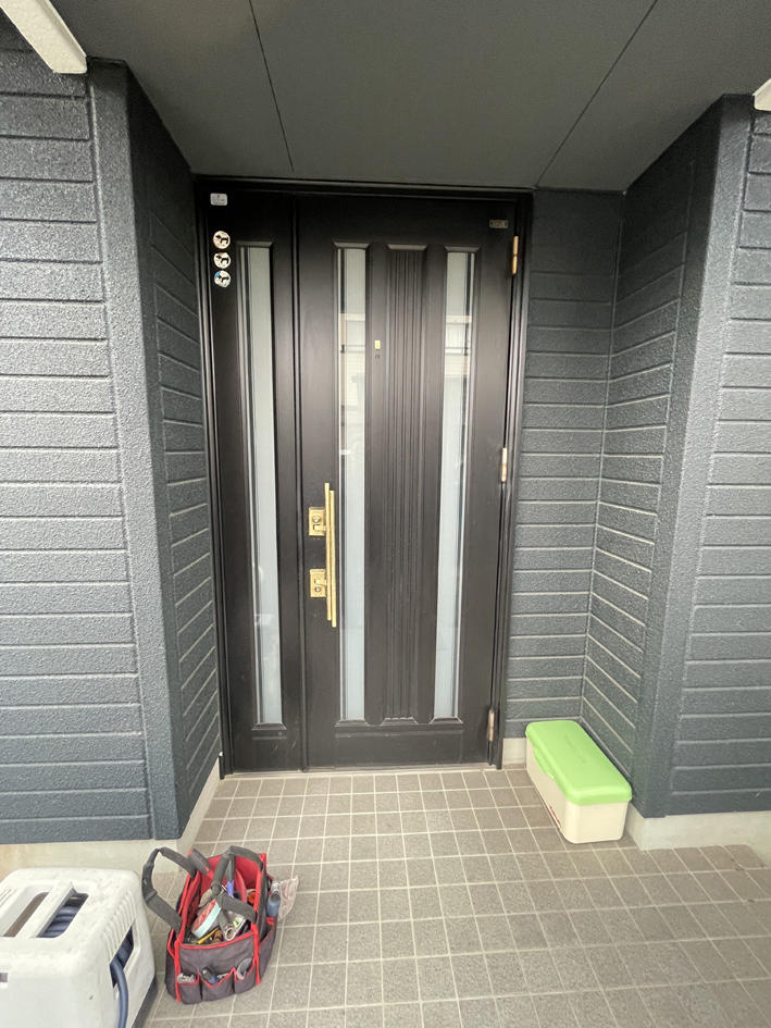 防犯性と断熱性を向上させるために、玄関ドアの取り替え工事を行いました。 見た目もすっきりしてシャープな印象の玄関ドアが完成しました。