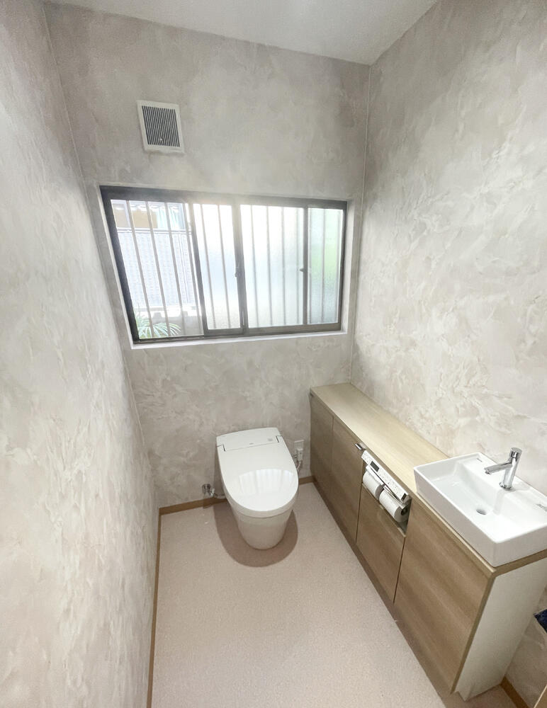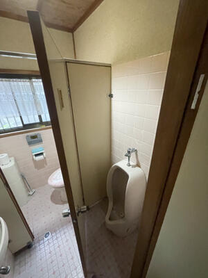 仕切られていた様式トイレと小便器を一つにまとめ、新しいトイレを設置しました。内装も一新し、すっきりとした清潔感のある空間に生まれ変わりました。右側には手洗い、収納、トイレットペーパーホルダーが一体となった設備を設置し、より機能的でスマートな仕上がりとなっています。