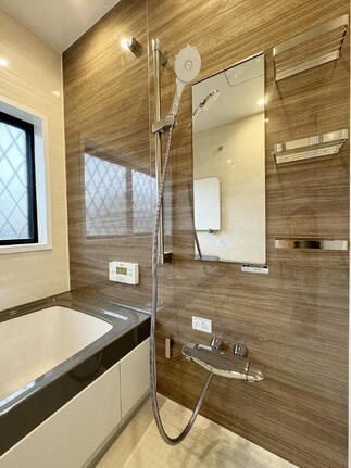 築25年のお風呂がリフォームで大変身! カビを寄せ付けないプラズマクラスターイオン搭載の換気乾燥暖房機で、お風呂をカビから守ります。 落ち着いた木目の柄でリラックスしたバスルームが楽しめます。