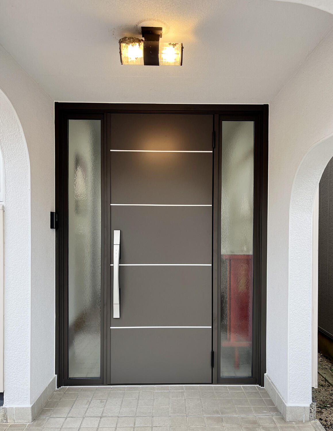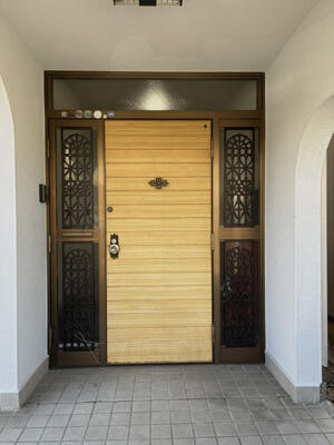 見た目もスッキリ、落ち着いた高級感のある玄関ドアに生まれ変わりました。左右には採光も取り入れられるガラスで、また防犯性、断熱性もアップしました。