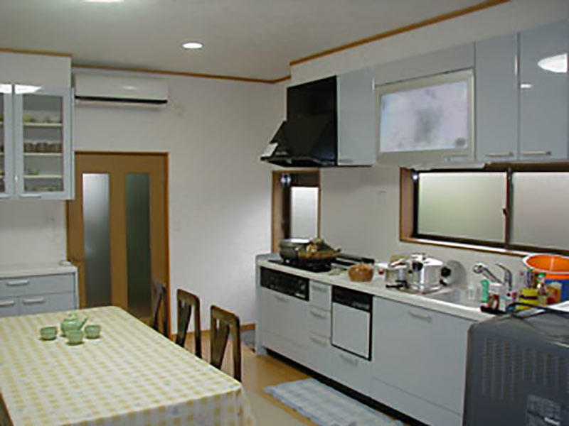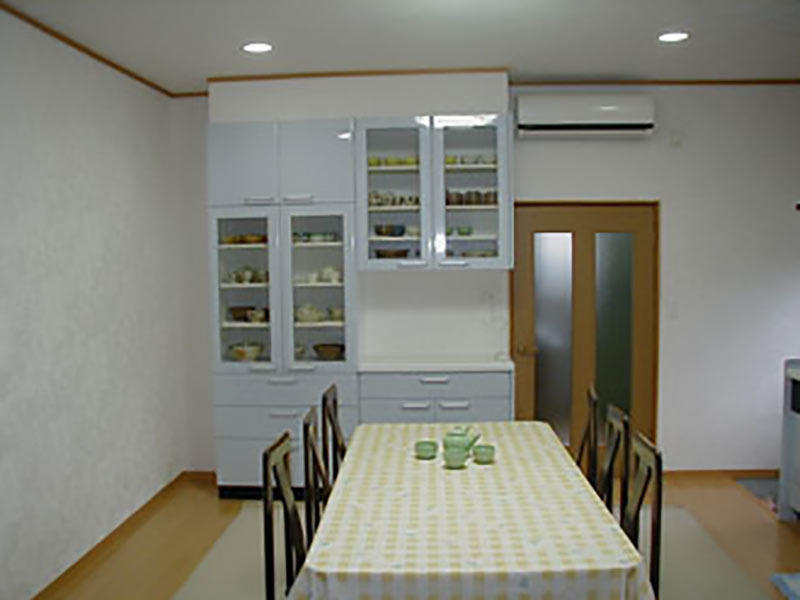 キッチンと同じシリーズのガラス収納棚を設置しました。 収納力があるので、たくさんの食器をしまうことが出来ます。 物を減らすことで、広々と空間を使えるようにしました。