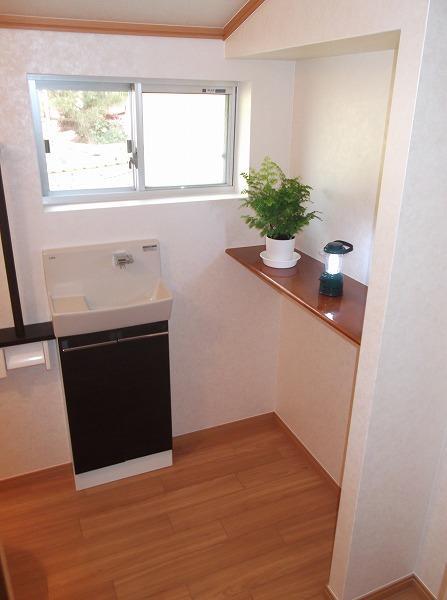 トイレが大小2室に分かれていて狭かったので、 中間の壁を撤去し、ゆったりとした1室に。 手洗いと飾り棚も設置し、おしゃれな空間になりました。