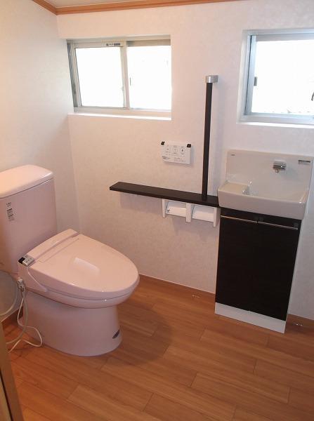 せっかくトイレをリフォームするので、将来のことも考え段差をなくし、手すりを設置して「バリアフリー」に。広々と使えるのも嬉しいですね。
